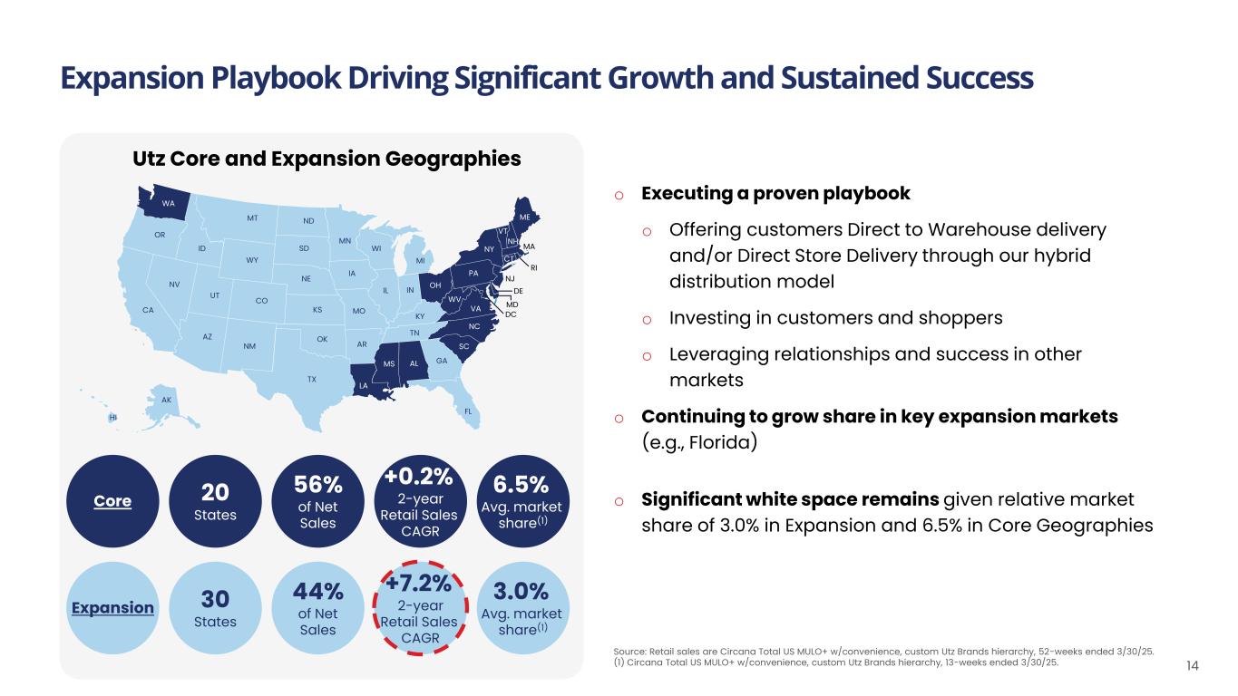 Growth Accelerating in Expansion Geographies with 1Q’25 Retail Volume up +8.9% 13 o Seventh consecutive quarter of share gains o Gained dollar and volume share for total Company and Power Four Brands o Growth driven by distribution gains and higher same store velocities o Strong dollar growth across Utz® and Zapp’s® Pretzels, Boulder Canyon® Potato Chips, and Golden Flake® Pork Rinds See Appendix for Utz Core and Expansion geography state groupings. Source: Retail sales and volume are Circana Total US MULO+ w/convenience, custom Utz Brands hierarchy, 13-weeks ended 3/30/2025; % YoY growth compared to the 13-weeks ended 3/31/2024 period in the prior year on a pro forma basis. 1Q’25 Expansion Geographies YoY Retail Growth Retail Volume (lbs.) Total Salty Category Total Company Power Four Brands -1.6% 4.9% 7.5% -1.7% 8.9% 10.9% Retail Sales $