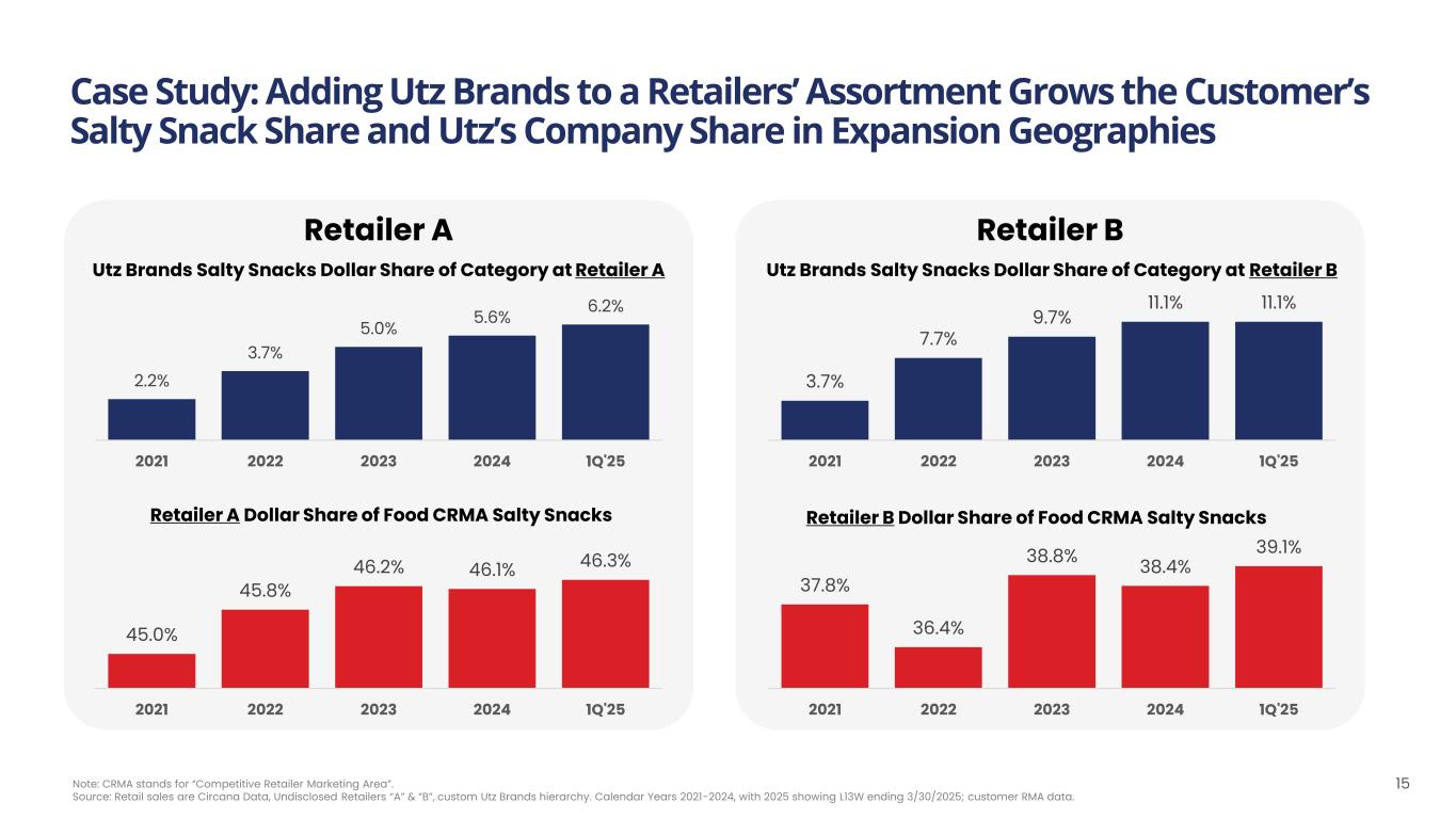 Expansion Playbook Driving Significant Growth and Sustained Success 14 Utz Core and Expansion Geographies Source: Retail sales are Circana Total US MULO+ w/convenience, custom Utz Brands hierarchy, 52-weeks ended 3/30/25. (1) Circana Total US MULO+ w/convenience, custom Utz Brands hierarchy, 13-weeks ended 3/30/25. FL NM DE MD TX OK KS NE SD NDMT WY COUT ID AZ NV WA CA OR KY ME NY PA VT NH MA RI CT WV INIL NC TN SC ALMS AR LA MO IA MN WI NJ GA DC VA OH MI HI AK o Executing a proven playbook o Offering customers Direct to Warehouse delivery and/or Direct Store Delivery through our hybrid distribution model o Investing in customers and shoppers o Leveraging relationships and success in other markets o Continuing to grow share in key expansion markets (e.g., Florida) o Significant white space remains given relative market share of 3.0% in Expansion and 6.5% in Core Geographies 56% of Net Sales +0.2% 2-year Retail Sales CAGR 6.5% Avg. market share(1) Core 44% of Net Sales +7.2% 2-year Retail Sales CAGR 3.0% Avg. market share(1) Expansion 20 States 30 States