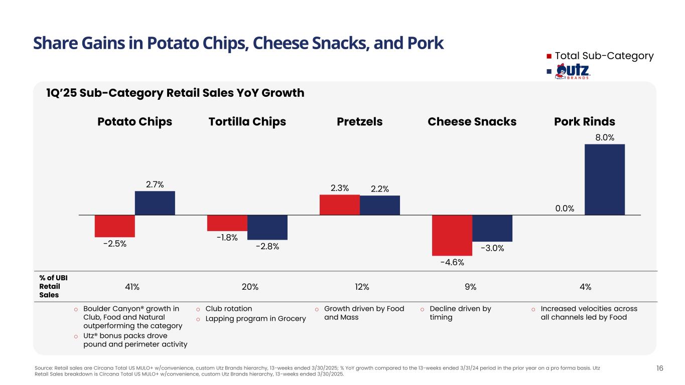 Retailer BRetailer A 45.0% 45.8% 46.2% 46.1% 46.3% 2021 2022 2023 2024 1Q'25 Utz Brands Salty Snacks Dollar Share of Category at Retailer B Retailer B Dollar Share of Food CRMA Salty Snacks Case Study: Adding Utz Brands to a Retailers’ Assortment Grows the Customer’s Salty Snack Share and Utz’s Company Share in Expansion Geographies 15 Utz Brands Salty Snacks Dollar Share of Category at Retailer A Retailer A Dollar Share of Food CRMA Salty Snacks Note: CRMA stands for “Competitive Retailer Marketing Area”. Source: Retail sales are Circana Data, Undisclosed Retailers “A” & “B”, custom Utz Brands hierarchy. Calendar Years 2021-2024, with 2025 showing L13W ending 3/30/2025; customer RMA data. 2.2% 3.7% 5.0% 5.6% 6.2% 2021 2022 2023 2024 1Q'25 3.7% 7.7% 9.7% 11.1% 11.1% 2021 2022 2023 2024 1Q'25 37.8% 36.4% 38.8% 38.4% 39.1% 2021 2022 2023 2024 1Q'25