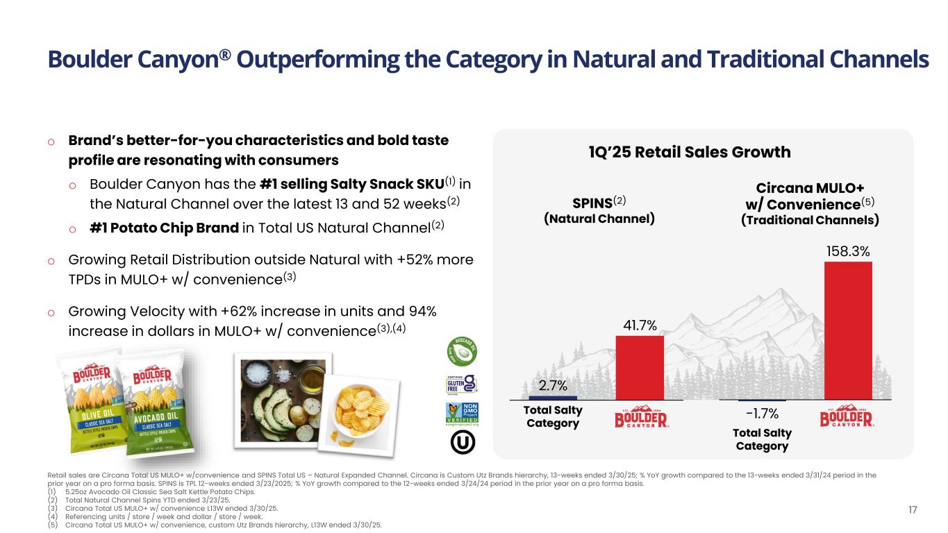 % of UBI Retail Sales 41% 20% 12% 9% 4% o Boulder Canyon® growth in Club, Food and Natural outperforming the category o Utz® bonus packs drove pound and perimeter activity o Club rotation o Lapping program in Grocery o Growth driven by Food and Mass o Decline driven by timing o Increased velocities across all channels led by Food Source: Retail sales are Circana Total US MULO+ w/convenience, custom Utz Brands hierarchy, 13-weeks ended 3/30/2025; % YoY growth compared to the 13-weeks ended 3/31/24 period in the prior year on a pro forma basis. Utz Retail Sales breakdown is Circana Total US MULO+ w/convenience, custom Utz Brands hierarchy, 13-weeks ended 3/30/2025. 1Q’25 Sub-Category Retail Sales YoY Growth Potato Chips Tortilla Chips Pretzels Cheese Snacks Pork Rinds -2.5% 2.7% -1.8% -2.8% 2.3% 2.2% -4.6% -3.0% 0.0% 8.0% 16 Share Gains in Potato Chips, Cheese Snacks, and Pork Total Sub-Category