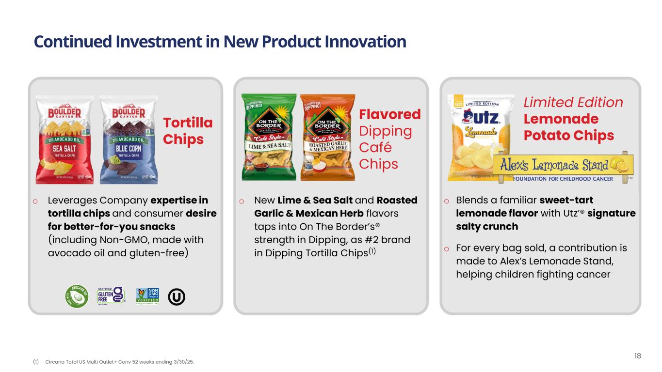 Boulder Canyon® Outperforming the Category in Natural and Traditional Channels 17 Total Salty Category 2.7% 41.7% Total Salty Category -1.7% 158.3% 1Q’25 Retail Sales Growth SPINS(2) (Natural Channel) Circana MULO+ w/ Convenience(5) (Traditional Channels) Retail sales are Circana Total US MULO+ w/convenience and SPINS Total US – Natural Expanded Channel. Circana is Custom Utz Brands hierarchy, 13-weeks ended 3/30/25; % YoY growth compared to the 13-weeks ended 3/31/24 period in the prior year on a pro forma basis. SPINS is TPL 12-weeks ended 3/23/2025; % YoY growth compared to the 12-weeks ended 3/24/24 period in the prior year on a pro forma basis. (1) 5.25oz Avocado Oil Classic Sea Salt Kettle Potato Chips. (2) Total Natural Channel Spins YTD ended 3/23/25. (3) Circana Total US MULO+ w/ convenience L13W ended 3/30/25. (4) Referencing units / store / week and dollar / store / week. (5) Circana Total US MULO+ w/ convenience, custom Utz Brands hierarchy, L13W ended 3/30/25. o Brand’s better-for-you characteristics and bold taste profile are resonating with consumers o Boulder Canyon has the #1 selling Salty Snack SKU(1) in the Natural Channel over the latest 13 and 52 weeks(2) o #1 Potato Chip Brand in Total US Natural Channel(2) o Growing Retail Distribution outside Natural with +52% more TPDs in MULO+ w/ convenience(3) o Growing Velocity with +62% increase in units and 94% increase in dollars in MULO+ w/ convenience(3),(4)