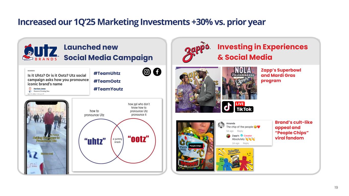 Continued Investment in New Product Innovation (1) Circana Total US Multi Outlet+ Conv 52 weeks ending 3/30/25. o New Lime & Sea Salt and Roasted Garlic & Mexican Herb flavors taps into On The Border’s® strength in Dipping, as #2 brand in Dipping Tortilla Chips(1) Flavored Dipping Café Chips o Blends a familiar sweet-tart lemonade flavor with Utz’® signature salty crunch o For every bag sold, a contribution is made to Alex’s Lemonade Stand, helping children fighting cancer Limited Edition Lemonade Potato Chips o Leverages Company expertise in tortilla chips and consumer desire for better-for-you snacks (including Non-GMO, made with avocado oil and gluten-free) Tortilla Chips 18