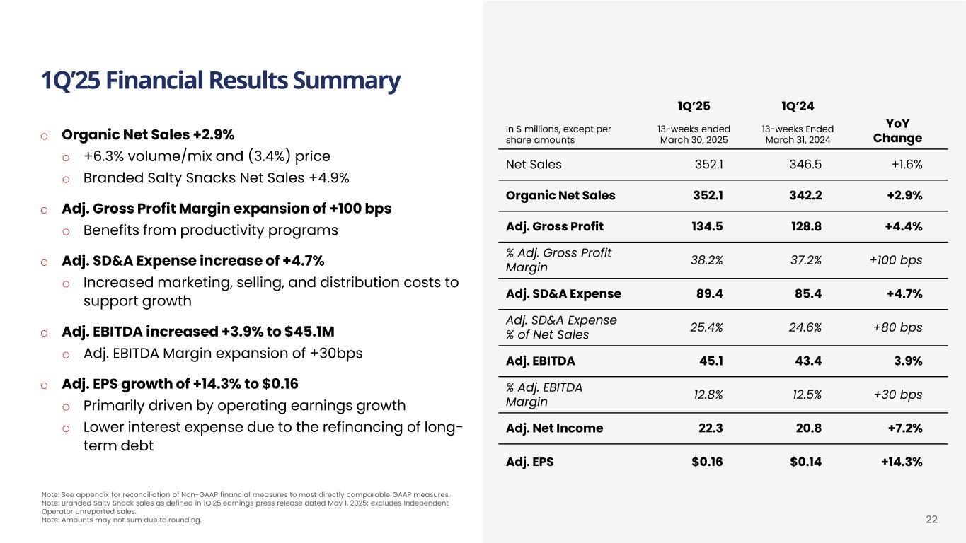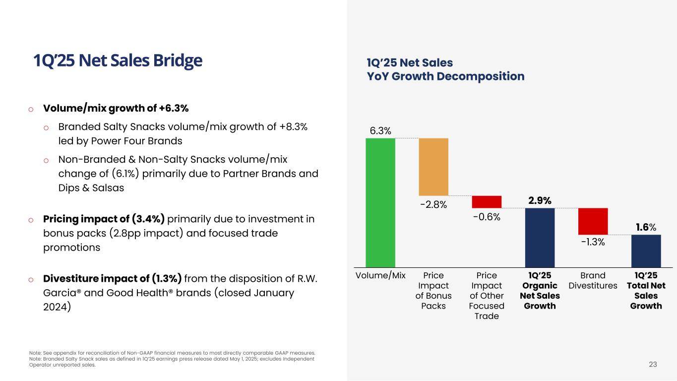 1Q’25 Financial Results Summary o Organic Net Sales +2.9% o +6.3% volume/mix and (3.4%) price o Branded Salty Snacks Net Sales +4.9% o Adj. Gross Profit Margin expansion of +100 bps o Benefits from productivity programs o Adj. SD&A Expense increase of +4.7% o Increased marketing, selling, and distribution costs to support growth o Adj. EBITDA increased +3.9% to $45.1M o Adj. EBITDA Margin expansion of +30bps o Adj. EPS growth of +14.3% to $0.16 o Primarily driven by operating earnings growth o Lower interest expense due to the refinancing of long- term debt 1Q’25 1Q’24 YoY Change In $ millions, except per share amounts 13-weeks ended March 30, 2025 13-weeks Ended March 31, 2024 Net Sales 352.1 346.5 +1.6% Organic Net Sales 352.1 342.2 +2.9% Adj. Gross Profit 134.5 128.8 +4.4% % Adj. Gross Profit Margin 38.2% 37.2% +100 bps Adj. SD&A Expense 89.4 85.4 +4.7% Adj. SD&A Expense % of Net Sales 25.4% 24.6% +80 bps Adj. EBITDA 45.1 43.4 3.9% % Adj. EBITDA Margin 12.8% 12.5% +30 bps Adj. Net Income 22.3 20.8 +7.2% Adj. EPS $0.16 $0.14 +14.3% 22 Note: See appendix for reconciliation of Non-GAAP financial measures to most directly comparable GAAP measures. Note: Branded Salty Snack sales as defined in 1Q’25 earnings press release dated May 1, 2025; excludes Independent Operator unreported sales. Note: Amounts may not sum due to rounding.