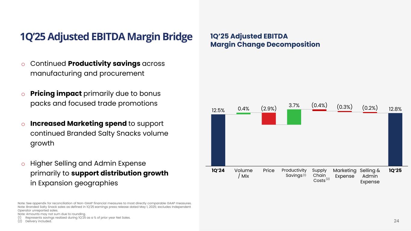 1Q’25 Net Sales Bridge 23 o Volume/mix growth of +6.3% o Branded Salty Snacks volume/mix growth of +8.3% led by Power Four Brands o Non-Branded & Non-Salty Snacks volume/mix change of (6.1%) primarily due to Partner Brands and Dips & Salsas o Pricing impact of (3.4%) primarily due to investment in bonus packs (2.8pp impact) and focused trade promotions o Divestiture impact of (1.3%) from the disposition of R.W. Garcia® and Good Health® brands (closed January 2024) 1Q’25 Net Sales YoY Growth Decomposition Volume/Mix Price Impact of Bonus Packs Price Impact of Other Focused Trade 1Q’25 Organic Net Sales Growth -1.3% Brand Divestitures 1Q’25 Total Net Sales Growth 6.3% -2.8% -0.6% 2.9% 1.6% Note: See appendix for reconciliation of Non-GAAP financial measures to most directly comparable GAAP measures. Note: Branded Salty Snack sales as defined in 1Q’25 earnings press release dated May 1, 2025; excludes Independent Operator unreported sales.