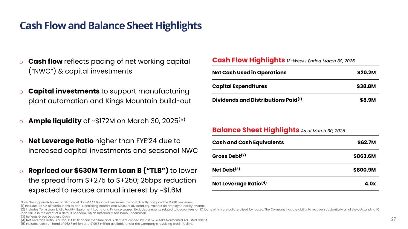 Cash Flow and Balance Sheet Highlights As of January 1, 2023 Cash Flow Highlights 13-Weeks Ended March 30, 2025 Net Cash Used in Operations $20.2M Capital Expenditures $38.8M Dividends and Distributions Paid(1) $8.9M Balance Sheet Highlights As of March 30, 2025 Cash and Cash Equivalents $62.7M Gross Debt(2) $863.6M Net Debt(3) $800.9M Net Leverage Ratio(4) 4.0x 27 Note: See appendix for reconciliation of Non-GAAP financial measures to most directly comparable GAAP measures. (1) Includes $3.5M of distributions to Non-Controlling Interest and $0.3M of dividend equivalents on employee equity awards. (2) Includes Term Loan B, ABL Facility, Equipment Loans, and Finance Leases. Excludes amounts related to guarantees on IO loans which are collateralized by routes. The Company has the ability to recover substantially all of the outstanding IO loan value in the event of a default scenario, which historically has been uncommon. (3) Reflects Gross Debt less Cash. (4) Net Leverage Ratio is a Non-GAAP financial measure and is Net Debt divided by last 52-weeks Normalized Adjusted EBITDA. (5) Includes cash on hand of $62.7 million and $109.5 million available under the Company’s revolving credit facility. o Cash flow reflects pacing of net working capital (“NWC”) & capital investments o Capital investments to support manufacturing plant automation and Kings Mountain build-out o Ample liquidity of ~$172M on March 30, 2025(5) o Net Leverage Ratio higher than FYE’24 due to increased capital investments and seasonal NWC o Repriced our $630M Term Loan B (“TLB”) to lower the spread from S+275 to S+250; 25bps reduction expected to reduce annual interest by ~$1.6M