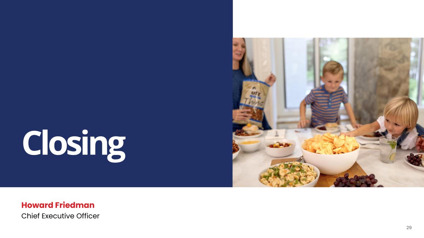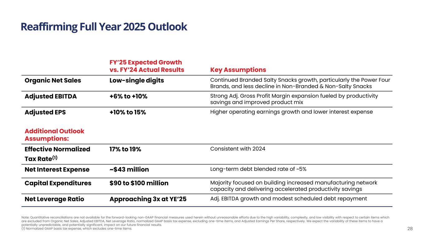 Note: Quantitative reconciliations are not available for the forward-looking non-GAAP financial measures used herein without unreasonable efforts due to the high variability, complexity, and low visibility with respect to certain items which are excluded from Organic Net Sales, Adjusted EBITDA, Net Leverage Ratio, normalized GAAP basis tax expense, excluding one-time items, and Adjusted Earnings Per Share, respectively. We expect the variability of these items to have a potentially unpredictable, and potentially significant, impact on our future financial results. (1) Normalized GAAP basis tax expense, which excludes one-time items. FY’25 Expected Growth vs. FY’24 Actual Results Key Assumptions Organic Net Sales Low-single digits Continued Branded Salty Snacks growth, particularly the Power Four Brands, and less decline in Non-Branded & Non-Salty Snacks Adjusted EBITDA +6% to +10% Strong Adj. Gross Profit Margin expansion fueled by productivity savings and improved product mix Adjusted EPS +10% to 15% Higher operating earnings growth and lower interest expense Additional Outlook Assumptions: Effective Normalized Tax Rate(1) 17% to 19% Consistent with 2024 Net Interest Expense ~$43 million Long-term debt blended rate of ~5% Capital Expenditures $90 to $100 million Majority focused on building increased manufacturing network capacity and delivering accelerated productivity savings Net Leverage Ratio Approaching 3x at YE’25 Adj. EBITDA growth and modest scheduled debt repayment Reaffirming Full Year 2025 Outlook 28