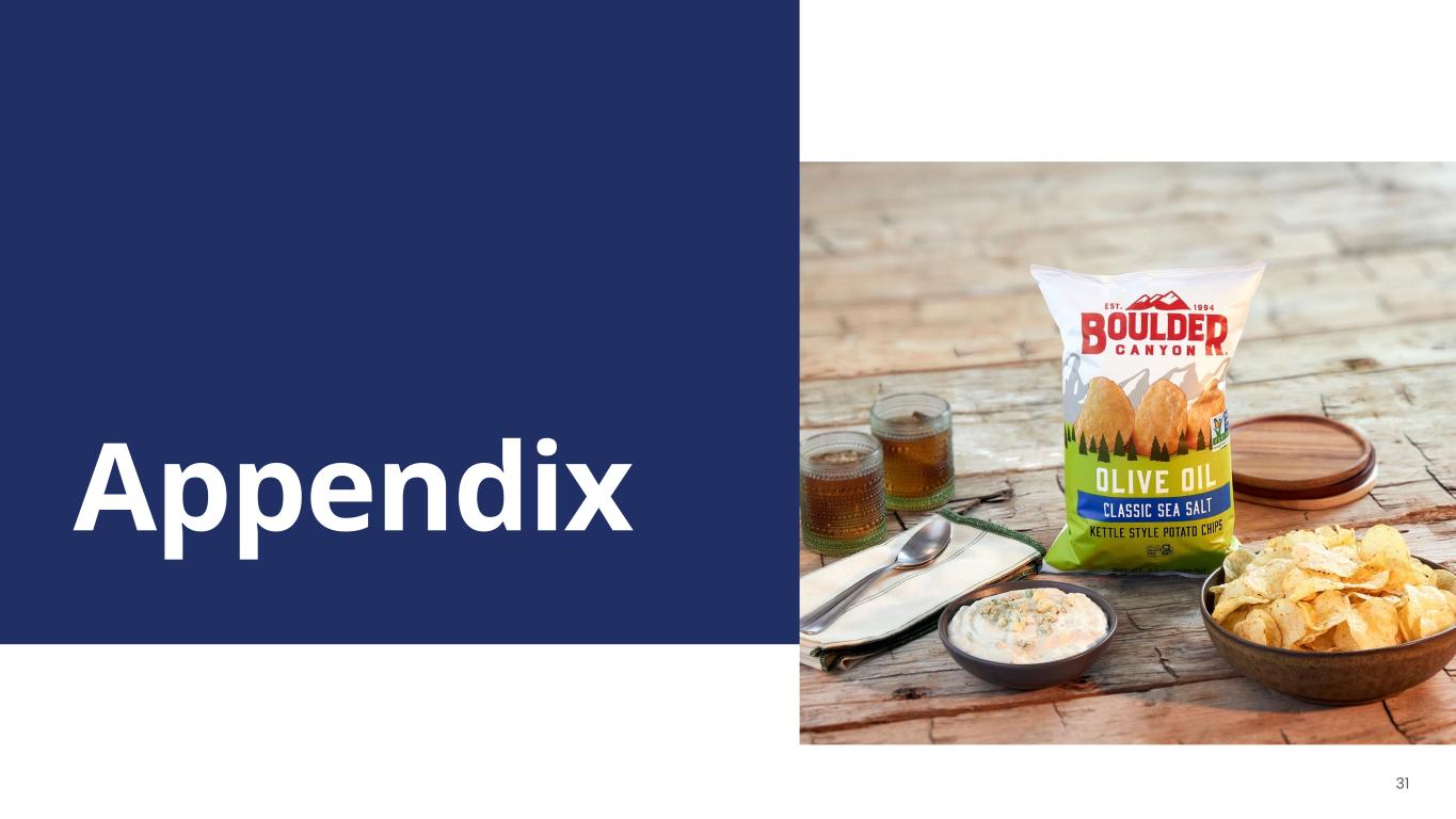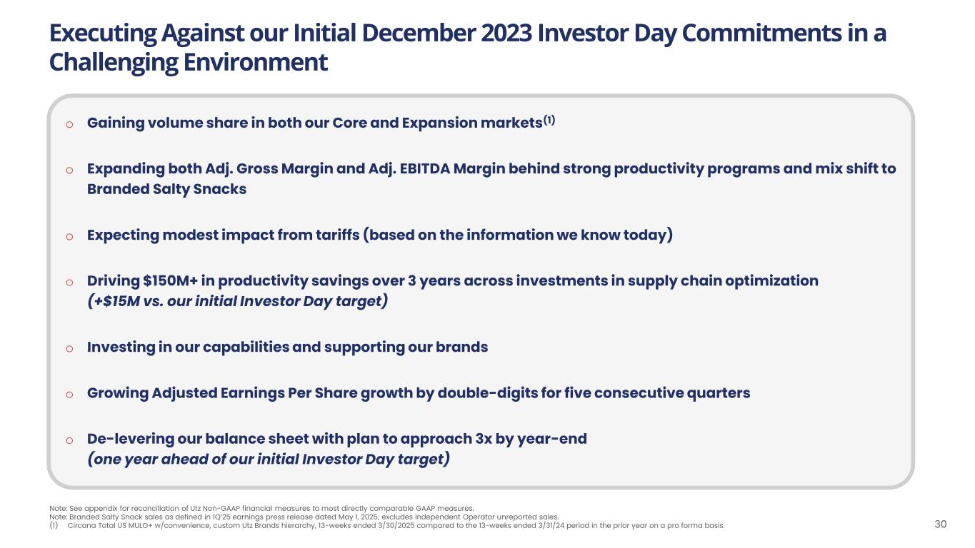 Executing Against our Initial December 2023 Investor Day Commitments in a Challenging Environment 30 o Gaining volume share in both our Core and Expansion markets(1) o Expanding both Adj. Gross Margin and Adj. EBITDA Margin behind strong productivity programs and mix shift to Branded Salty Snacks o Expecting modest impact from tariffs (based on the information we know today) o Driving $150M+ in productivity savings over 3 years across investments in supply chain optimization (+$15M vs. our initial Investor Day target) o Investing in our capabilities and supporting our brands o Growing Adjusted Earnings Per Share growth by double-digits for five consecutive quarters o De-levering our balance sheet with plan to approach 3x by year-end (one year ahead of our initial Investor Day target) Note: See appendix for reconciliation of Utz Non-GAAP financial measures to most directly comparable GAAP measures. Note: Branded Salty Snack sales as defined in 1Q’25 earnings press release dated May 1, 2025; excludes Independent Operator unreported sales. (1) Circana Total US MULO+ w/convenience, custom Utz Brands hierarchy, 13-weeks ended 3/30/2025 compared to the 13-weeks ended 3/31/24 period in the prior year on a pro forma basis.