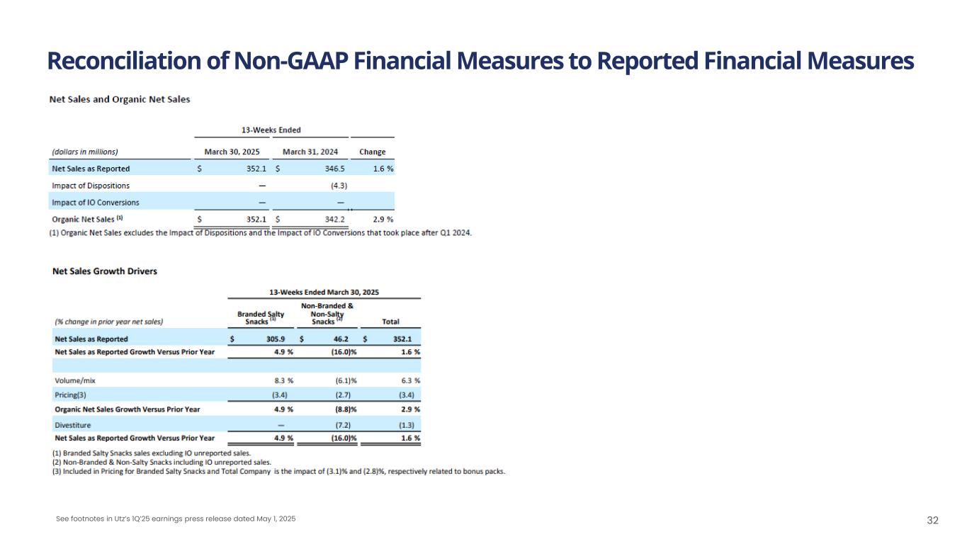 Reconciliation of Non-GAAP Financial Measures to Reported Financial Measures 32See footnotes in Utz’s 1Q’25 earnings press release dated May 1, 2025