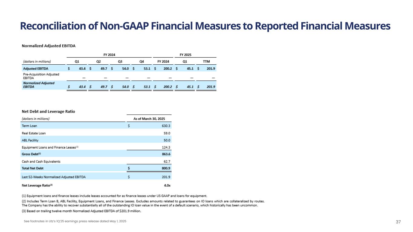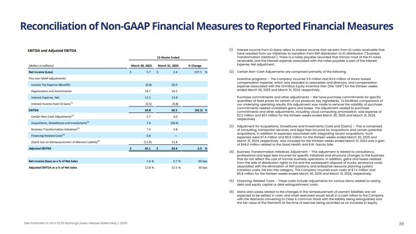 Reconciliation of Non-GAAP Financial Measures to Reported Financial Measures 36See footnotes in Utz’s 1Q’25 earnings press release dated May 1, 2025 (1) Interest Income from IO loans refers to Interest Income that we earn from IO notes receivable that have resulted from our initiatives to transition from RSP distribution to IO distribution ("Business Transformation Initiatives"). There is a notes payable recorded that mirrors most of the IO notes receivable, and the interest expense associated with the notes payable is part of the Interest Expense, Net adjustment. (2) Certain Non-Cash Adjustments are comprised primarily of the following: Incentive programs – The Company incurred 3.5 million and $3.9 million of share-based compensation expense, which was awarded to associates and directors, and compensation expense associated with the Omnibus Equity Incentive Plan (the "OEIP") for the thirteen weeks ended March 30, 2025 and March 31, 2024, respectively. Purchase commitments and other adjustments – We have purchase commitments for specific quantities at fixed prices for certain of our products’ key ingredients. To facilitate comparisons of our underlying operating results, this adjustment was made to remove the volatility of purchase commitments related unrealized gains and losses. The adjustment related to purchase commitments and other adjustments, including cloud computing amortization, was expense of $2.2 million and $0.1 million for the thirteen weeks ended March 30, 2025 and March 31, 2024, respectively. (3) Adjustment for Acquisitions, Divestitures and Investments Costs and (Gains) – This is comprised of consulting, transaction services, and legal fees incurred for acquisitions and certain potential acquisitions, in addition to expenses associated with integrating recent acquisitions. Such expenses were $7.4 million and $5.6 million for the thirteen weeks ended March 30, 2025 and March 31, 2024, respectively. Also included for the thirteen weeks ended March 31, 2024 was a gain of $44.0 million related to the Good Health and R.W. Garcia Sale. (4) Business Transformation Initiatives Adjustment – This adjustment is related to consultancy, professional and legal fees incurred for specific initiatives and structural changes to the business that do not reflect the cost of normal business operations. In addition, gains and losses realized from the sale of distribution rights to IOs and the subsequent disposal of trucks, severance costs associated with the elimination of RSP positions, and enterprise resource planning system transition costs, fall into this category. The Company incurred such costs of $7.4 million and $5.8 million for the thirteen weeks ended March 30, 2025 and March 31, 2024, respectively. (5) Financing-Related Costs – These costs include adjustments for various items related to raising debt and equity capital or debt extinguishment costs. (6) Gains and Losses related to the changes in the remeasurement of warrant liabilities are not expected to be settled in cash, and when exercised would result in a cash inflow to the Company with the Warrants converting to Class A Common Stock with the liability being extinguished and the fair value of the Warrants at the time of exercise being recorded as an increase to equity.
