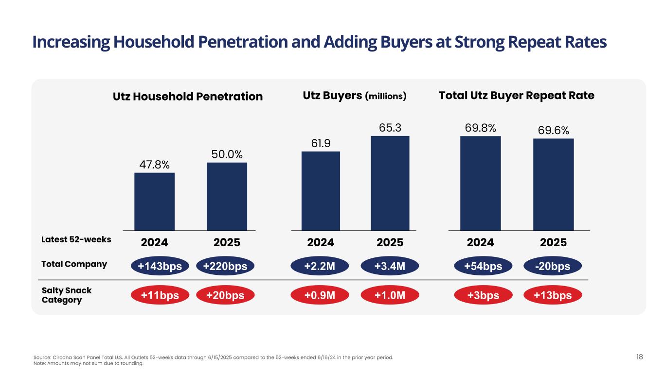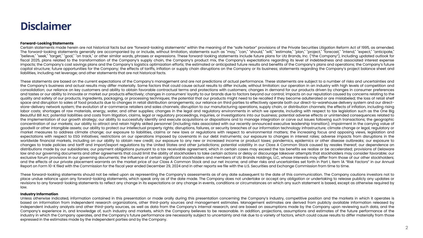 Disclaimer 2 Forward-Looking Statements Certain statements made herein are not historical facts but are “forward-looking statements” within the meaning of the “safe harbor” provisions of the Private Securities Litigation Reform Act of 1995, as amended. The forward-looking statements generally are accompanied by or include, without limitation, statements such as "may," "can," "should," "will," "estimate," "plan," "project," "forecast," "intend," "expect," "anticipate," "believe," "seek," "target," "goal," "on track," or other similar words, phrases or expressions. These forward-looking statements include future plans for Utz Brands, Inc. (“the Company”), including updated outlook for fiscal 2025, plans related to the transformation of the Company’s supply chain, the Company’s product mix, the Company's expectations regarding its level of indebtedness and associated interest expense impacts; the Company’s cost savings plans and the Company’s logistics optimization efforts; the estimated or anticipated future results and benefits of the Company’s plans and operations; the Company’s future capital structure; future opportunities for the Company; the effects of tariffs, inflation or supply chain disruptions on the Company or its business; statements regarding the Company’s project balance sheet and liabilities, including net leverage; and other statements that are not historical facts. These statements are based on the current expectations of the Company’s management and are not predictions of actual performance. These statements are subject to a number of risks and uncertainties and the Company’s business and actual results may differ materially. Some factors that could cause actual results to differ include, without limitation: our operation in an industry with high levels of competition and consolidation; our reliance on key customers and ability to obtain favorable contractual terms and protections with customers; changes in demand for our products driven by changes in consumer preferences and tastes or our ability to innovate or market our products effectively; changes in consumers’ loyalty to our brands due to factors beyond our control; impacts on our reputation caused by concerns relating to the quality and safety of our products, ingredients, packaging, or processing techniques; the potential that our products might need to be recalled if they become adulterated or are mislabeled; the loss of retail shelf space and disruption to sales of food products due to changes in retail distribution arrangements; our reliance on third parties to effectively operate both our direct-to-warehouse delivery system and our direct- store-delivery network system; the evolution of e-commerce retailers and sales channels; disruption to our manufacturing operations, supply chain, or distribution channels; the effects of inflation, including rising labor costs; shortages of raw materials, energy, water, and other supplies; changes in the legal and regulatory environments in which we operate, including with respect to tax legislation such as the One Big Beautiful Bill Act; potential liabilities and costs from litigation, claims, legal or regulatory proceedings, inquiries, or investigations into our business; potential adverse effects or unintended consequences related to the implementation of our growth strategy; our ability to successfully identify and execute acquisitions or dispositions and to manage integration or carve out issues following such transactions; the geographic concentration of our markets; our ability to attract and retain highly skilled personnel (including risks associated with our recently announced executive leadership transition); impairment in the carrying value of goodwill or other intangible assets; our ability to protect our intellectual property rights; disruptions, failures, or security breaches of our information technology infrastructure; climate change or legal, regulatory or market measures to address climate change; our exposure to liabilities, claims or new laws or regulations with respect to environmental matters; the increasing focus and opposing views, legislation and expectations with respect to ESG initiatives; restrictions on our operations imposed by covenants in our debt instruments; our exposure to changes in interest rates; adverse impacts from disruptions in the worldwide financial markets, including on our ability to obtain new credit; our exposure to any new or increased income or product taxes; pandemics, epidemics or other disease outbreaks; our exposure to changes to trade policies and tariff and import/export regulations by the United States and other jurisdictions; potential volatility in our Class A Common Stock caused by resales thereof; our dependence on distributions made by our subsidiaries; our payment obligations pursuant to a tax receivable agreement, which in certain cases may exceed the tax benefits we realize or be accelerated; provisions of Delaware law and our governing documents and other agreements that could limit the ability of stockholders to take certain actions or delay or discourage takeover attempts that stockholders may consider favorable; our exclusive forum provisions in our governing documents; the influence of certain significant stockholders and members of Utz Brands Holdings, LLC, whose interests may differ from those of our other stockholders; and the effects of our private placement warrants on the market price of our Class A Common Stock and our net income; and other risks and uncertainties set forth in Part I, Item 1A “Risk Factors” in our Annual Report on Form 10-K filed with the Commission for the fiscal year ended December 29, 2024 and in other reports we file with the U.S. Securities and Exchange Commission from time to time. These forward-looking statements should not be relied upon as representing the Company’s assessments as of any date subsequent to the date of this communicati