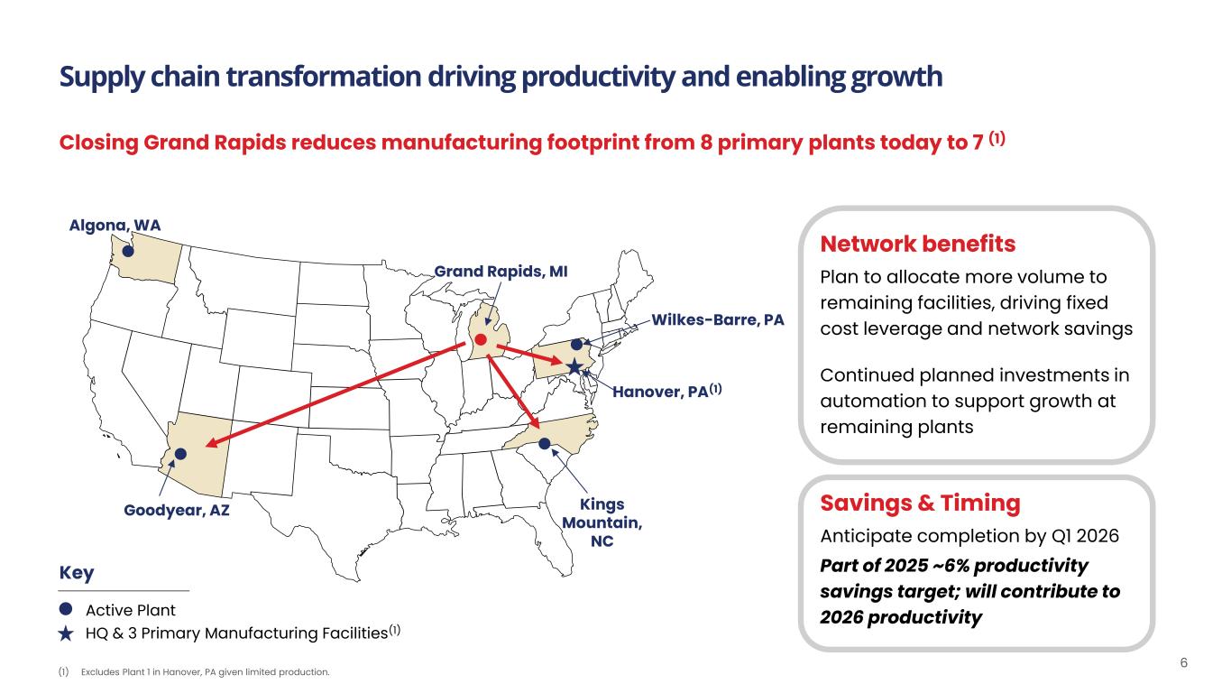 Closing Grand Rapids reduces manufacturing footprint from 8 primary plants today to 7 (1) Supply chain transformation driving productivity and enabling growth 6 Active Plant HQ & 3 Primary Manufacturing Facilities(1) Key Algona, WA Goodyear, AZ Grand Rapids, MI Kings Mountain, NC Wilkes-Barre, PA Hanover, PA(1) (1) Excludes Plant 1 in Hanover, PA given limited production. Savings & Timing Anticipate completion by Q1 2026 Part of 2025 ~6% productivity savings target; will contribute to 2026 productivity Network benefits Plan to allocate more volume to remaining facilities, driving fixed cost leverage and network savings Continued planned investments in automation to support growth at remaining plants