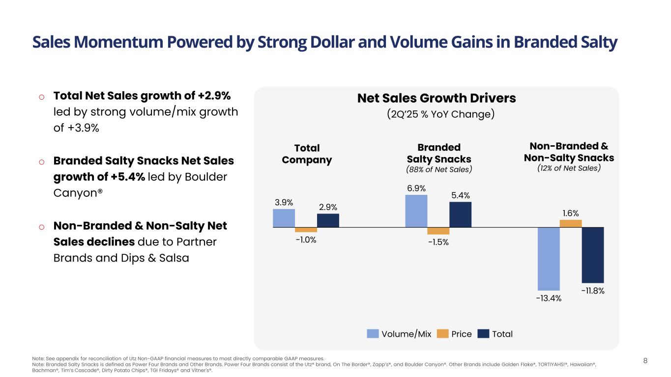 2Q’25 – Sales Momentum and Investment in Growth 7 Adj. EBITDA (in millions) 2Q’23 2Q’24 2Q’25 $45.2 $49.7 $48.7 Note: See appendix for reconciliation of Utz Non-GAAP financial measures to most directly comparable GAAP measures. (1) Not adjusted for acquisitions, divestitures or IO transitions (2) Compound annual growth rates referenced are on a two-year basis Adj. EPS $0.13 $0.19 $0.17 2Q’23 2Q’24 2Q’25 Organic Net Sales (in millions) 2Q’23 2Q’24 2Q’25 $351.1 $366.7$356.2 +15% CAGR+4% CAGR+2.2% CAGR (1) (1)-2.0% +2.9% -10.5%
