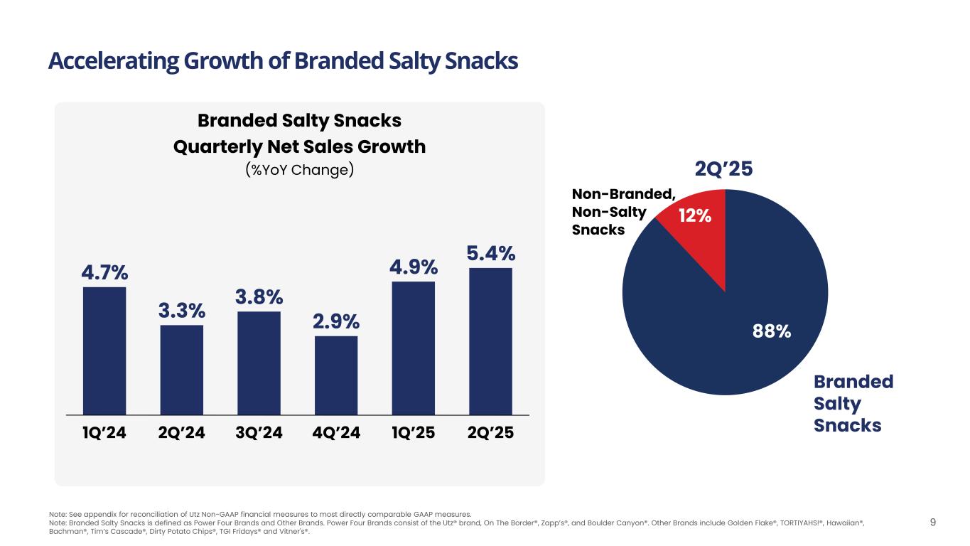 8Note: See appendix for reconciliation of Utz Non-GAAP financial measures to most directly comparable GAAP measures. Note: Branded Salty Snacks is defined as Power Four Brands and Other Brands. Power Four Brands consist of the Utz® brand, On The Border®, Zapp’s®, and Boulder Canyon®. Other Brands include Golden Flake®, TORTIYAHS!®, Hawaiian®, Bachman®, Tim’s Cascade®, Dirty Potato Chips®, TGI Fridays® and Vitner's®. Sales Momentum Powered by Strong Dollar and Volume Gains in Branded Salty Non-Branded & Non-Salty Snacks (12% of Net Sales) Total Company 3.9% -1.0% 2.9% 6.9% -1.5% 5.4% -13.4% 1.6% -11.8% (2Q’25 % YoY Change) Volume/Mix Price Total Net Sales Growth Driverso Total Net Sales growth of +2.9% led by strong volume/mix growth of +3.9% o Branded Salty Snacks Net Sales growth of +5.4% led by Boulder Canyon® o Non-Branded & Non-Salty Net Sales declines due to Partner Brands and Dips & Salsa Branded Salty Snacks (88% of Net Sales)