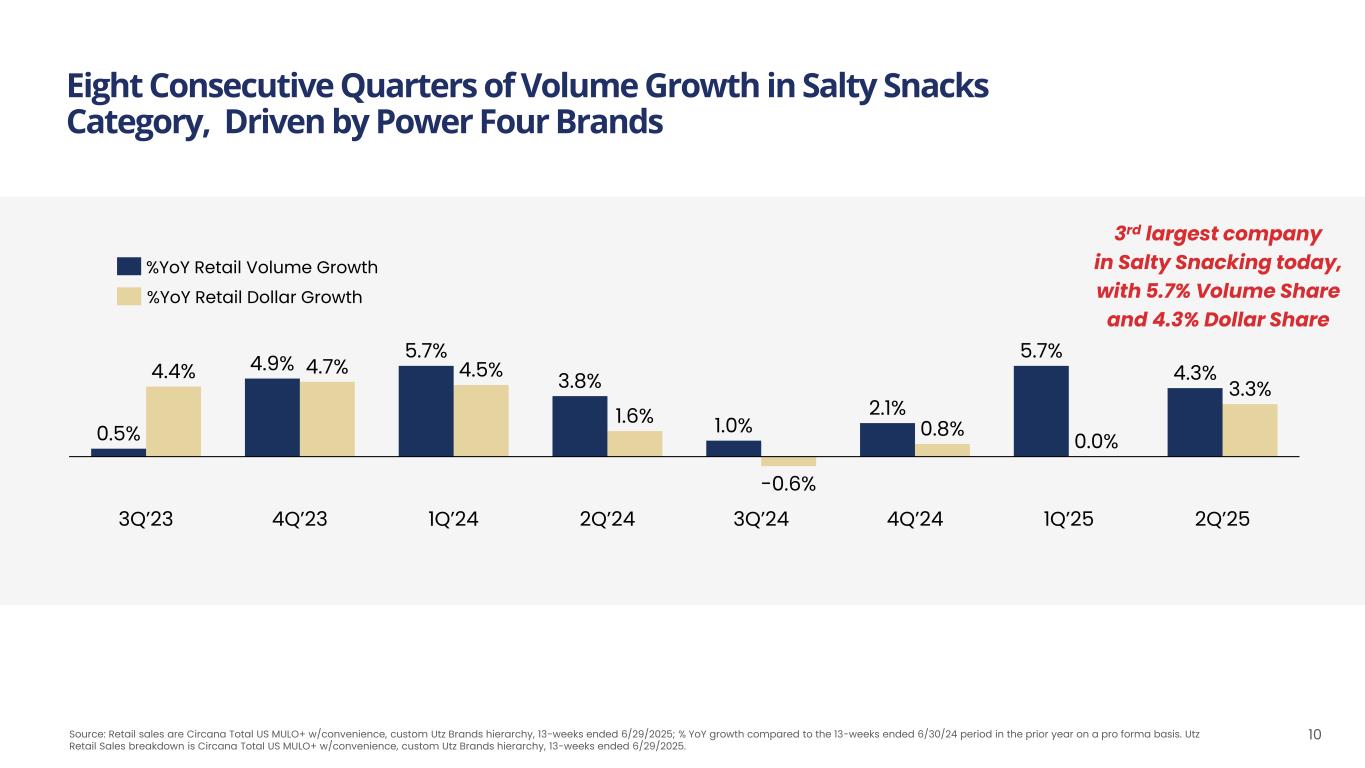 1Q’24 2Q’24 3Q’24 4Q’24 1Q’25 2Q’25 4.7% 3.3% 3.8% 2.9% 4.9% 5.4% Accelerating Growth of Branded Salty Snacks 9 Branded Salty Snacks Quarterly Net Sales Growth (%YoY Change) Note: See appendix for reconciliation of Utz Non-GAAP financial measures to most directly comparable GAAP measures. Note: Branded Salty Snacks is defined as Power Four Brands and Other Brands. Power Four Brands consist of the Utz® brand, On The Border®, Zapp’s®, and Boulder Canyon®. Other Brands include Golden Flake®, TORTIYAHS!®, Hawaiian®, Bachman®, Tim’s Cascade®, Dirty Potato Chips®, TGI Fridays® and Vitner's®. 88% 12% 2Q’25 Branded Salty Snacks Non-Branded, Non-Salty Snacks