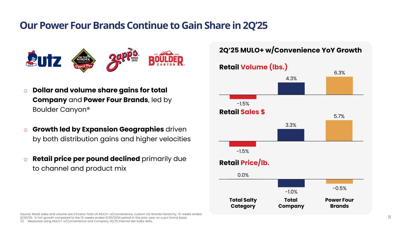 Eight Consecutive Quarters of Volume Growth in Salty Snacks Category, Driven by Power Four Brands 10 3Q’23 4Q’23 1Q’24 2Q’24 3Q’24 4Q’24 1Q’25 2Q’25 0.5% 4.4% 4.9% 4.7% 5.7% 4.5% 3.8% 1.6% 1.0% -0.6% 2.1% 0.8% 5.7% 0.0% 4.3% 3.3% %YoY Retail Volume Growth %YoY Retail Dollar Growth 3rd largest company in Salty Snacking today, with 5.7% Volume Share and 4.3% Dollar Share Source: Retail sales are Circana Total US MULO+ w/convenience, custom Utz Brands hierarchy, 13-weeks ended 6/29/2025; % YoY growth compared to the 13-weeks ended 6/30/24 period in the prior year on a pro forma basis. Utz Retail Sales breakdown is Circana Total US MULO+ w/convenience, custom Utz Brands hierarchy, 13-weeks ended 6/29/2025.