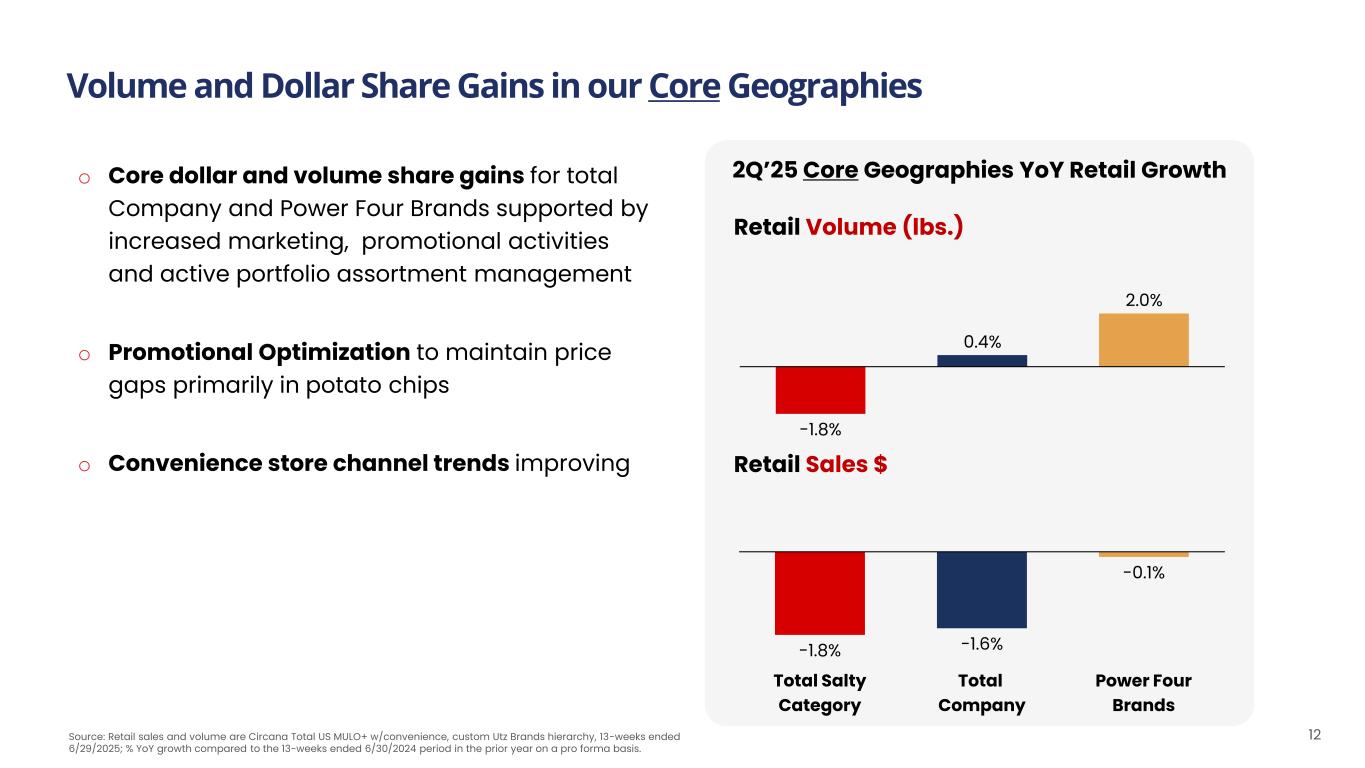 Our Power Four Brands Continue to Gain Share in 2Q’25 11 2Q’25 MULO+ w/Convenience YoY Growth -1.5% 4.3% 6.3% Retail Volume (lbs.) Total Salty Category Total Company Power Four Brands 0.0% -1.0% -0.5% Retail Price/lb. -1.5% 3.3% 5.7% Retail Sales $ Source: Retail sales and volume are Circana Total US MULO+ w/convenience, custom Utz Brands hierarchy, 13-weeks ended 6/29/25; % YoY growth compared to the 13-weeks ended 6/30/2024 period in the prior year on a pro forma basis. (1) Measured using MULO+ w/Convenience and Company 2Q’25 internal Net Sales data. o Dollar and volume share gains for total Company and Power Four Brands, led by Boulder Canyon® o Growth led by Expansion Geographies driven by both distribution gains and higher velocities o Retail price per pound declined primarily due to channel and product mix