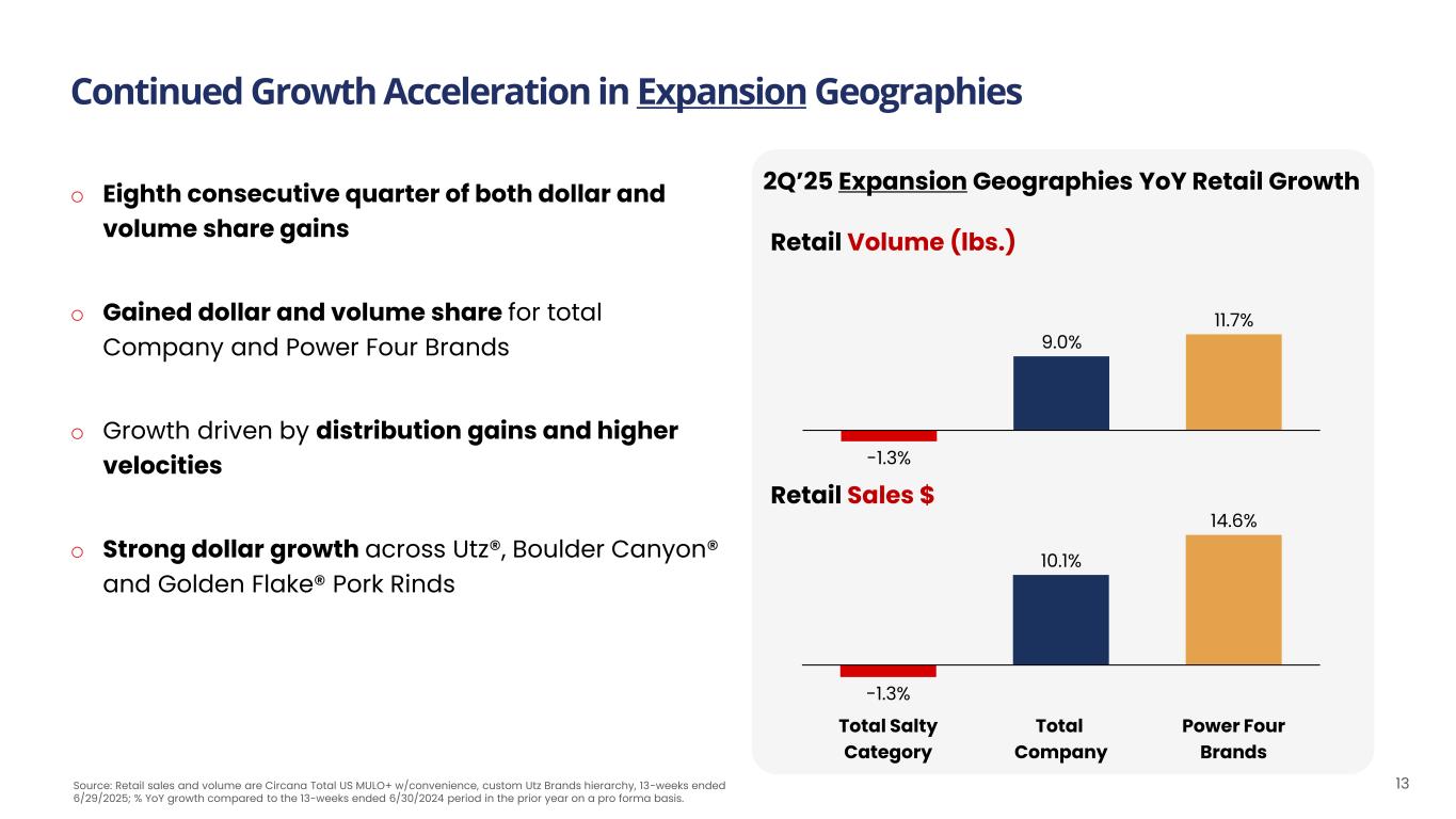 2Q’25 Core Geographies YoY Retail Growth Retail Volume (lbs.) Source: Retail sales and volume are Circana Total US MULO+ w/convenience, custom Utz Brands hierarchy, 13-weeks ended 6/29/2025; % YoY growth compared to the 13-weeks ended 6/30/2024 period in the prior year on a pro forma basis. Volume and Dollar Share Gains in our Core Geographies 12 Total Salty Category Total Company Power Four Brands -1.8% -1.6% -0.1% -1.8% 0.4% 2.0% Retail Sales $ o Core dollar and volume share gains for total Company and Power Four Brands supported by increased marketing, promotional activities and active portfolio assortment management o Promotional Optimization to maintain price gaps primarily in potato chips o Convenience store channel trends improving