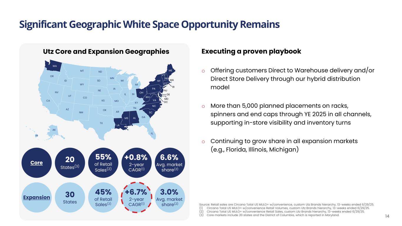Continued Growth Acceleration in Expansion Geographies 13 o Eighth consecutive quarter of both dollar and volume share gains o Gained dollar and volume share for total Company and Power Four Brands o Growth driven by distribution gains and higher velocities o Strong dollar growth across Utz®, Boulder Canyon® and Golden Flake® Pork Rinds 2Q’25 Expansion Geographies YoY Retail Growth Retail Volume (lbs.) Total Salty Category Total Company Power Four Brands -1.3% 10.1% 14.6% -1.3% 9.0% 11.7% Retail Sales $ Source: Retail sales and volume are Circana Total US MULO+ w/convenience, custom Utz Brands hierarchy, 13-weeks ended 6/29/2025; % YoY growth compared to the 13-weeks ended 6/30/2024 period in the prior year on a pro forma basis.