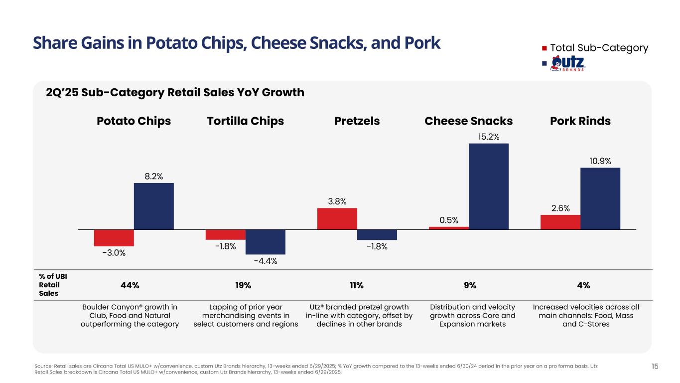 Significant Geographic White Space Opportunity Remains 14 Utz Core and Expansion Geographies FL NM DE MD TX OK KS NE SD NDMT WY COUT ID AZ NV WA CA OR KY ME NY PA VT NH MA RI CT WV INIL NC TN SC ALMS AR LA MO IA MN WI NJ GA DC VA OH MI HI AK Executing a proven playbook o Offering customers Direct to Warehouse delivery and/or Direct Store Delivery through our hybrid distribution model o More than 5,000 planned placements on racks, spinners and end caps through YE 2025 in all channels, supporting in-store visibility and inventory turns o Continuing to grow share in all expansion markets (e.g., Florida, Illinois, Michigan) 55% of Retail Sales(2) +0.8% 2-year CAGR(1) 6.6% Avg. market share(2) Core 45% of Retail Sales(2) +6.7% 2-year CAGR(1) 3.0% Avg. market share(2) Expansion 20 States(3) 30 States Source: Retail sales are Circana Total US MULO+ w/convenience, custom Utz Brands hierarchy, 13-weeks ended 6/29/25. (1) Circana Total US MULO+ w/convenience Retail Volumes, custom Utz Brands hierarchy, 13-weeks ended 6/29/25. (2) Circana Total US MULO+ w/convenience Retail Sales, custom Utz Brands hierarchy, 13-weeks ended 6/29/25. (3) Core markets include 20 states and the District of Columbia, which is reported in Maryland.
