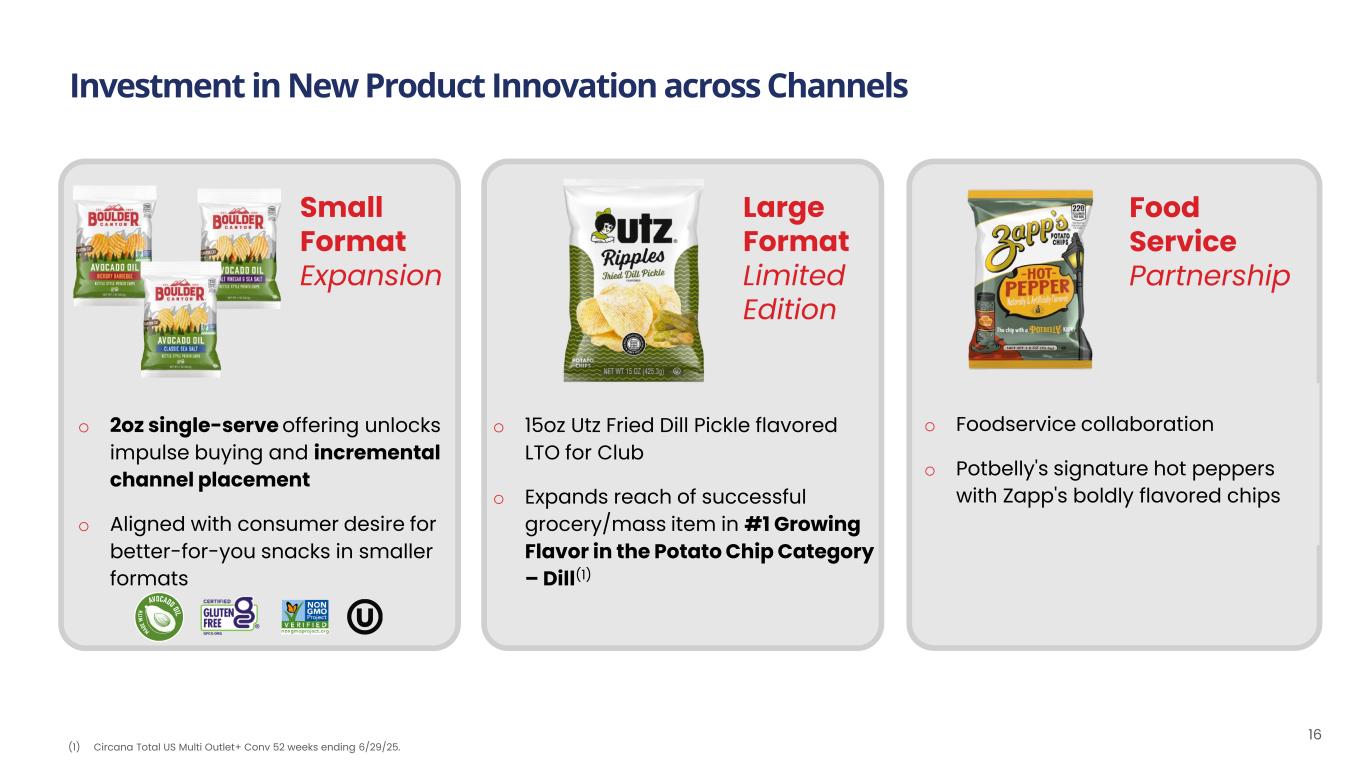 % of UBI Retail Sales 44% 19% 11% 9% 4% Boulder Canyon® growth in Club, Food and Natural outperforming the category Lapping of prior year merchandising events in select customers and regions Utz® branded pretzel growth in-line with category, offset by declines in other brands Distribution and velocity growth across Core and Expansion markets Increased velocities across all main channels: Food, Mass and C-Stores Source: Retail sales are Circana Total US MULO+ w/convenience, custom Utz Brands hierarchy, 13-weeks ended 6/29/2025; % YoY growth compared to the 13-weeks ended 6/30/24 period in the prior year on a pro forma basis. Utz Retail Sales breakdown is Circana Total US MULO+ w/convenience, custom Utz Brands hierarchy, 13-weeks ended 6/29/2025. 2Q’25 Sub-Category Retail Sales YoY Growth Potato Chips Tortilla Chips Pretzels Cheese Snacks Pork Rinds -3.0% 8.2% -1.8% -4.4% 3.8% -1.8% 0.5% 15.2% 2.6% 10.9% 15 Share Gains in Potato Chips, Cheese Snacks, and Pork Total Sub-Category