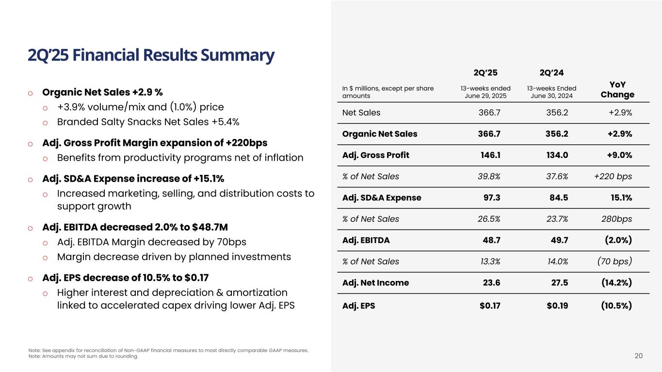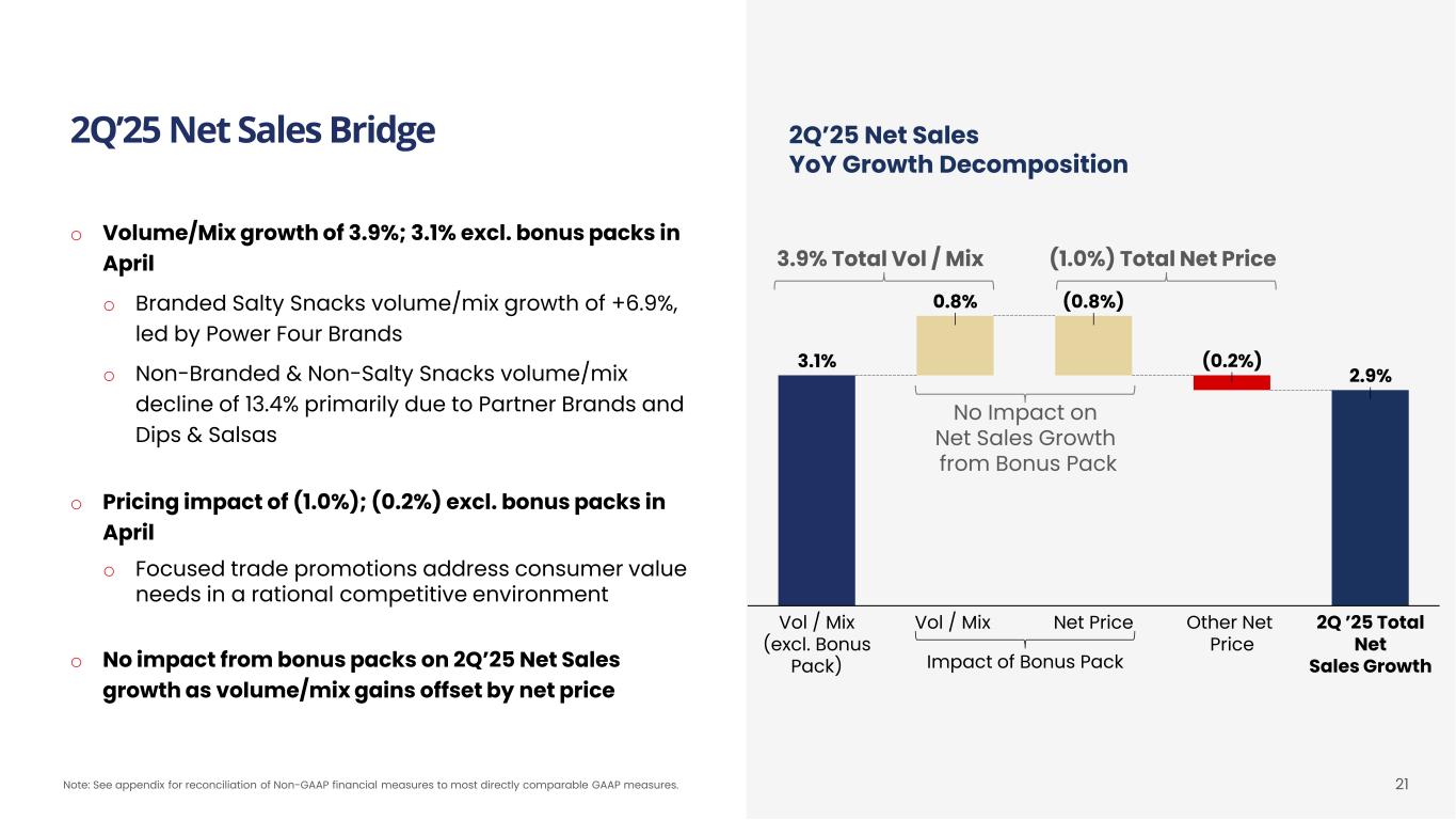 2Q’25 Financial Results Summary o Organic Net Sales +2.9 % o +3.9% volume/mix and (1.0%) price o Branded Salty Snacks Net Sales +5.4% o Adj. Gross Profit Margin expansion of +220bps o Benefits from productivity programs net of inflation o Adj. SD&A Expense increase of +15.1% o Increased marketing, selling, and distribution costs to support growth o Adj. EBITDA decreased 2.0% to $48.7M o Adj. EBITDA Margin decreased by 70bps o Margin decrease driven by planned investments o Adj. EPS decrease of 10.5% to $0.17 o Higher interest and depreciation & amortization linked to accelerated capex driving lower Adj. EPS 2Q’25 2Q’24 YoY Change In $ millions, except per share amounts 13-weeks ended June 29, 2025 13-weeks Ended June 30, 2024 Net Sales 366.7 356.2 +2.9% Organic Net Sales 366.7 356.2 +2.9% Adj. Gross Profit 146.1 134.0 +9.0% % of Net Sales 39.8% 37.6% +220 bps Adj. SD&A Expense 97.3 84.5 15.1% % of Net Sales 26.5% 23.7% 280bps Adj. EBITDA 48.7 49.7 (2.0%) % of Net Sales 13.3% 14.0% (70 bps) Adj. Net Income 23.6 27.5 (14.2%) Adj. EPS $0.17 $0.19 (10.5%) 20 Note: See appendix for reconciliation of Non-GAAP financial measures to most directly comparable GAAP measures. Note: Amounts may not sum due to rounding.