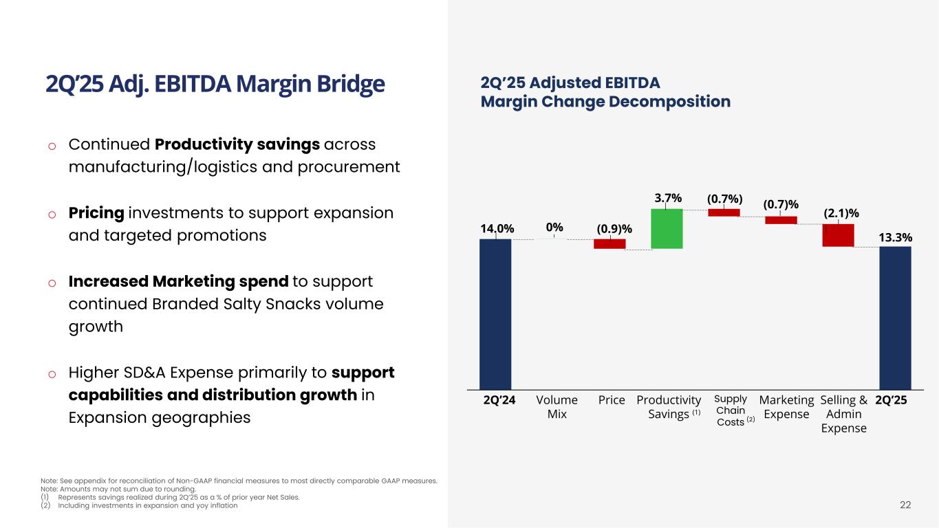 21 2Q’25 Net Sales YoY Growth Decomposition Note: See appendix for reconciliation of Non-GAAP financial measures to most directly comparable GAAP measures. Vol / Mix (excl. Bonus Pack) 0.8% Vol / Mix (0.8%) Net Price (0.2%) Other Net Price 2.9% 2Q ’25 Total Net Sales Growth 3.1% 3.9% Total Vol / Mix Impact of Bonus Pack (1.0%) Total Net Price No Impact on Net Sales Growth from Bonus Pack o Volume/Mix growth of 3.9%; 3.1% excl. bonus packs in April o Branded Salty Snacks volume/mix growth of +6.9%, led by Power Four Brands o Non-Branded & Non-Salty Snacks volume/mix decline of 13.4% primarily due to Partner Brands and Dips & Salsas o Pricing impact of (1.0%); (0.2%) excl. bonus packs in April o Focused trade promotions address consumer value needs in a rational competitive environment o No impact from bonus packs on 2Q’25 Net Sales growth as volume/mix gains offset by net price 2Q’25 Net Sales Bridge