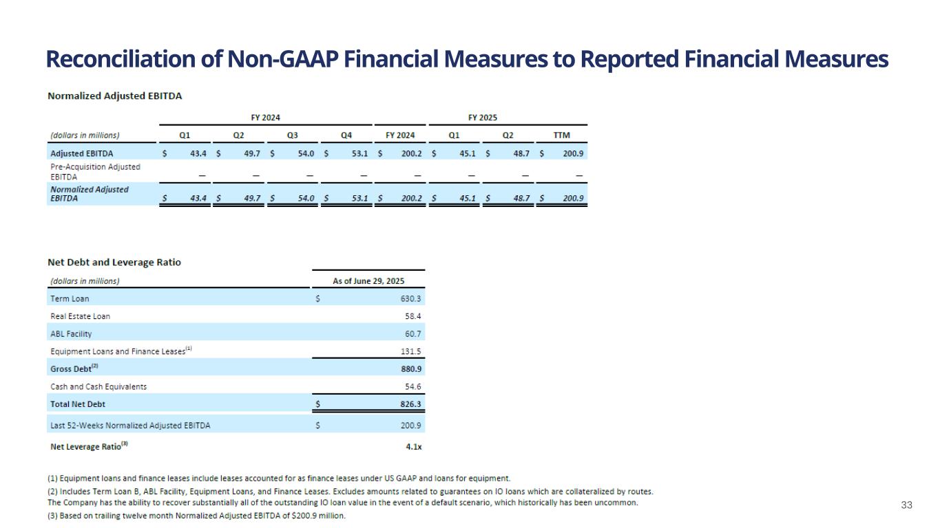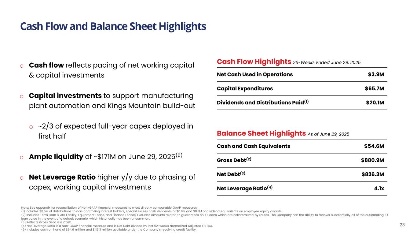 Cash Flow and Balance Sheet Highlights As of January 1, 2023 Cash Flow Highlights 26-Weeks Ended June 29, 2025 Net Cash Used in Operations $3.9M Capital Expenditures $65.7M Dividends and Distributions Paid(1) $20.1M Balance Sheet Highlights As of June 29, 2025 Cash and Cash Equivalents $54.6M Gross Debt(2) $880.9M Net Debt(3) $826.3M Net Leverage Ratio(4) 4.1x 23 Note: See appendix for reconciliation of Non-GAAP financial measures to most directly comparable GAAP measures. (1) Includes $8.5M of distributions to non-controlling interest holders, special excess cash dividends of $0.9M and $0.3M of dividend equivalents on employee equity awards. (2) Includes Term Loan B, ABL Facility, Equipment Loans, and Finance Leases. Excludes amounts related to guarantees on IO loans which are collateralized by routes. The Company has the ability to recover substantially all of the outstanding IO loan value in the event of a default scenario, which historically has been uncommon. (3) Reflects Gross Debt less Cash. (4) Net Leverage Ratio is a Non-GAAP financial measure and is Net Debt divided by last 52-weeks Normalized Adjusted EBITDA. (5) Includes cash on hand of $54.6 million and $116.3 million available under the Company’s revolving credit facility. o Cash flow reflects pacing of net working capital & capital investments o Capital investments to support manufacturing plant automation and Kings Mountain build-out o ~2/3 of expected full-year capex deployed in first half o Ample liquidity of ~$171M on June 29, 2025(5) o Net Leverage Ratio higher y/y due to phasing of capex, working capital investments