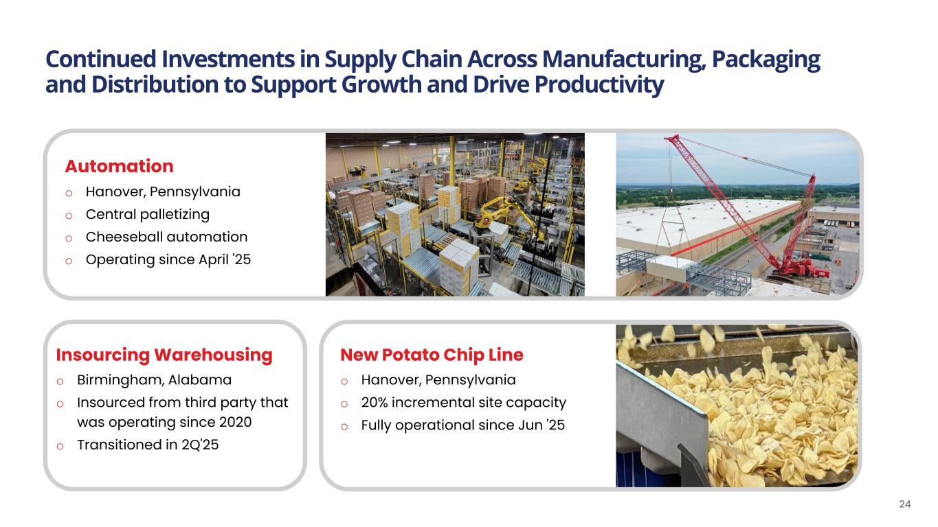 Automation o Hanover, Pennsylvania o Central palletizing o Cheeseball automation o Operating since April '25 Insourcing Warehousing o Birmingham, Alabama o Insourced from third party that was operating since 2020 o Transitioned in 2Q'25 Continued Investments in Supply Chain Across Manufacturing, Packaging and Distribution to Support Growth and Drive Productivity 24 New Potato Chip Line o Hanover, Pennsylvania o 20% incremental site capacity o Fully operational since Jun '25