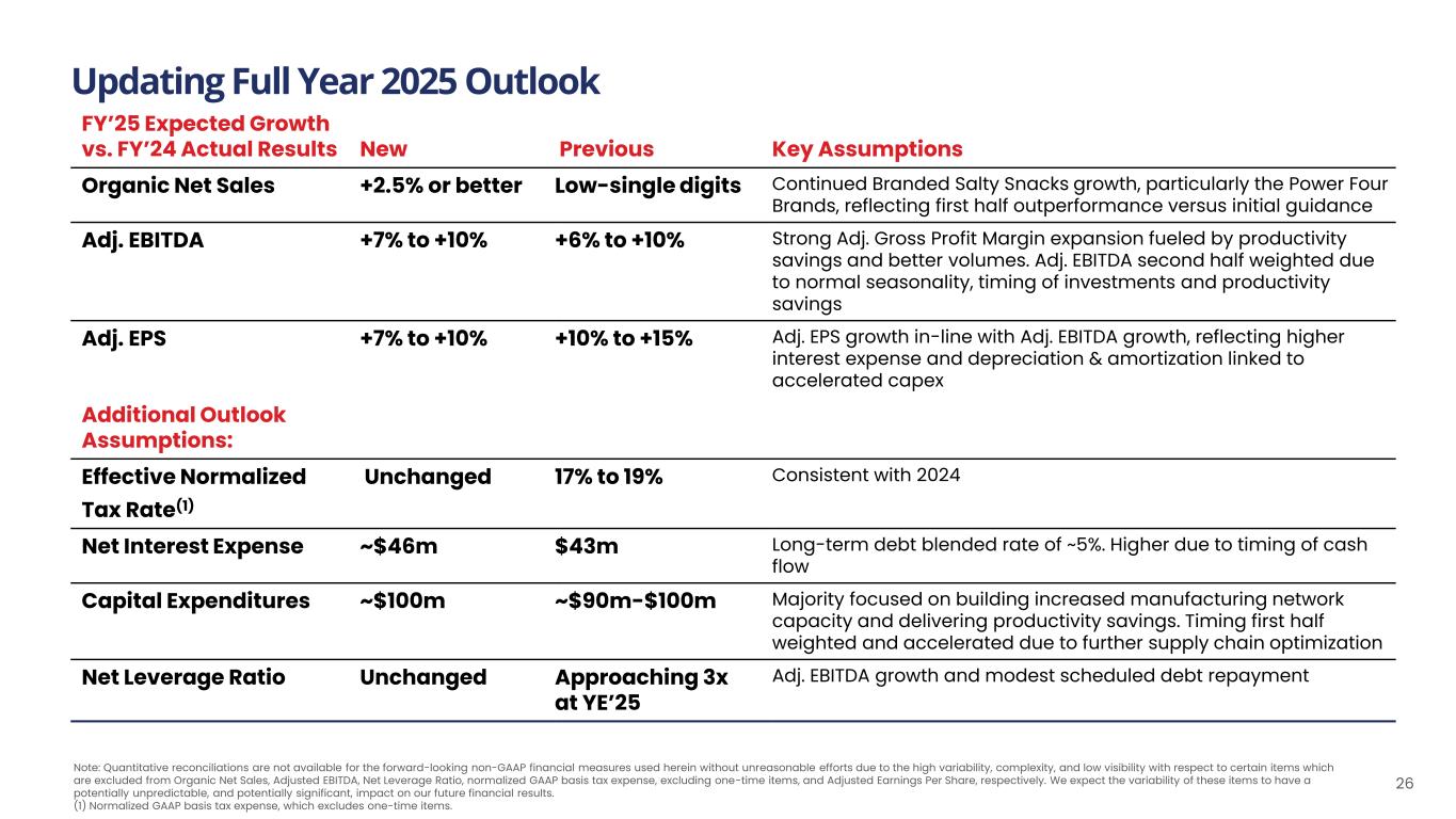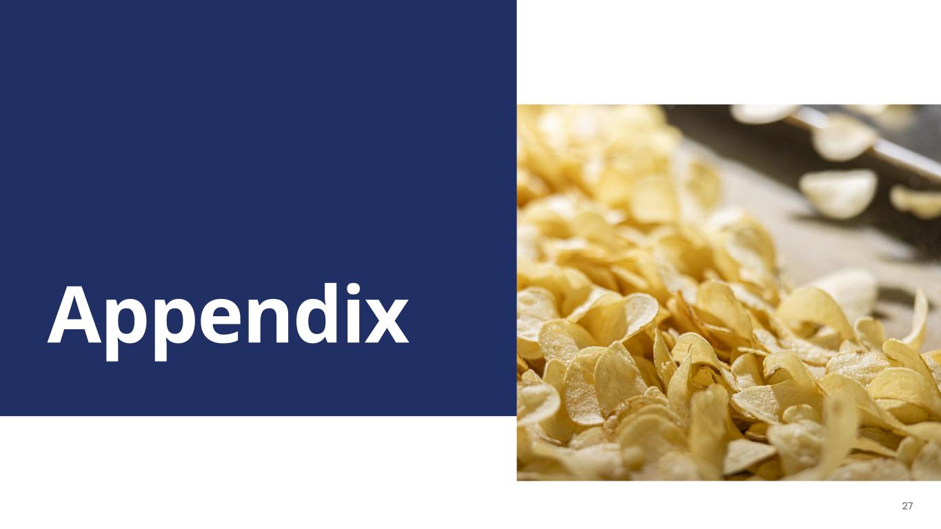 Note: Quantitative reconciliations are not available for the forward-looking non-GAAP financial measures used herein without unreasonable efforts due to the high variability, complexity, and low visibility with respect to certain items which are excluded from Organic Net Sales, Adjusted EBITDA, Net Leverage Ratio, normalized GAAP basis tax expense, excluding one-time items, and Adjusted Earnings Per Share, respectively. We expect the variability of these items to have a potentially unpredictable, and potentially significant, impact on our future financial results. (1) Normalized GAAP basis tax expense, which excludes one-time items. FY’25 Expected Growth vs. FY’24 Actual Results New Previous Key Assumptions Organic Net Sales +2.5% or better Low-single digits Continued Branded Salty Snacks growth, particularly the Power Four Brands, reflecting first half outperformance versus initial guidance Adj. EBITDA +7% to +10% +6% to +10% Strong Adj. Gross Profit Margin expansion fueled by productivity savings and better volumes. Adj. EBITDA second half weighted due to normal seasonality, timing of investments and productivity savings Adj. EPS +7% to +10% +10% to +15% Adj. EPS growth in-line with Adj. EBITDA growth, reflecting higher interest expense and depreciation & amortization linked to accelerated capex Additional Outlook Assumptions: Effective Normalized Tax Rate(1) Unchanged 17% to 19% Consistent with 2024 Net Interest Expense ~$46m $43m Long-term debt blended rate of ~5%. Higher due to timing of cash flow Capital Expenditures ~$100m ~$90m-$100m Majority focused on building increased manufacturing network capacity and delivering productivity savings. Timing first half weighted and accelerated due to further supply chain optimization Net Leverage Ratio Unchanged Approaching 3x at YE’25 Adj. EBITDA growth and modest scheduled debt repayment Updating Full Year 2025 Outlook 26