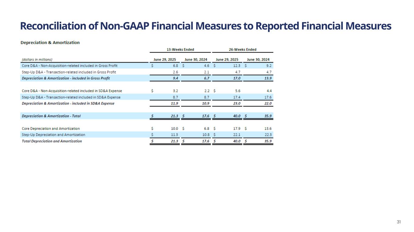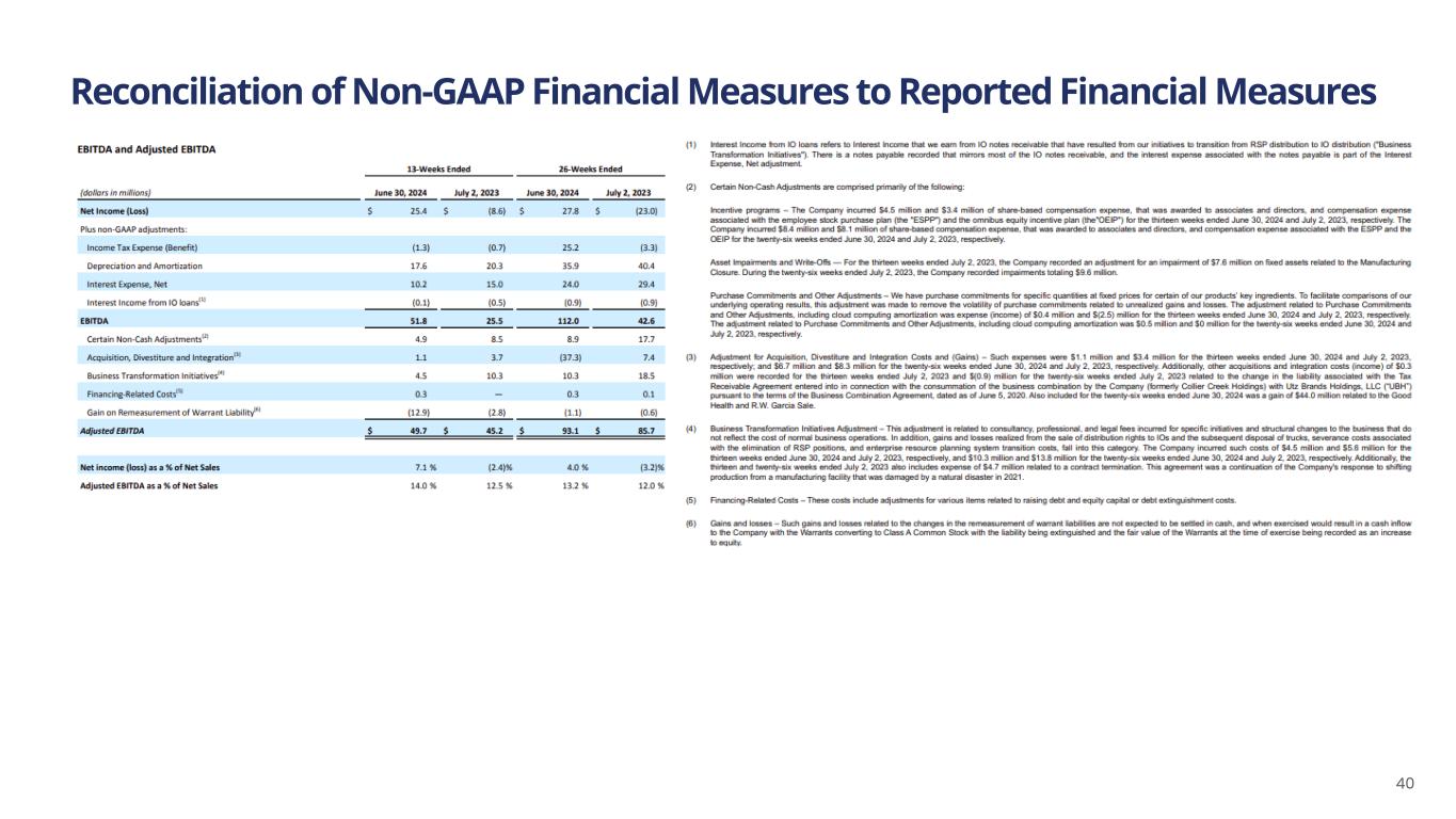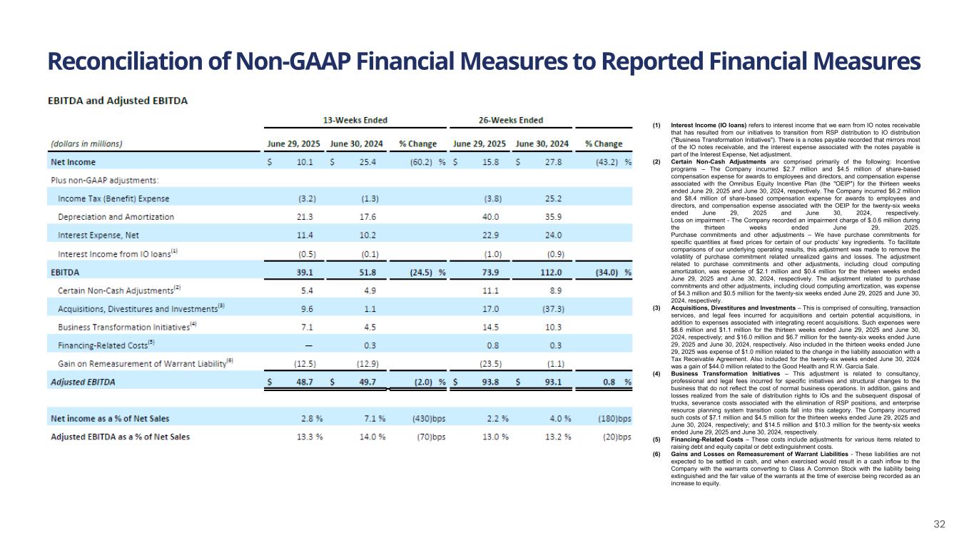 Reconciliation of Non-GAAP Financial Measures to Reported Financial Measures 32 (1) Interest Income (IO loans) refers to interest income that we earn from IO notes receivable that has resulted from our initiatives to transition from RSP distribution to IO distribution ("Business Transformation Initiatives"). There is a notes payable recorded that mirrors most of the IO notes receivable, and the interest expense associated with the notes payable is part of the Interest Expense, Net adjustment. (2) Certain Non-Cash Adjustments are comprised primarily of the following: Incentive programs – The Company incurred $2.7 million and $4.5 million of share-based compensation expense for awards to employees and directors, and compensation expense associated with the Omnibus Equity Incentive Plan (the "OEIP") for the thirteen weeks ended June 29, 2025 and June 30, 2024, respectively. The Company incurred $6.2 million and $8.4 million of share-based compensation expense for awards to employees and directors, and compensation expense associated with the OEIP for the twenty-six weeks ended June 29, 2025 and June 30, 2024, respectively. Loss on impairment - The Company recorded an impairment charge of $.0.6 million during the thirteen weeks ended June 29, 2025. Purchase commitments and other adjustments – We have purchase commitments for specific quantities at fixed prices for certain of our products’ key ingredients. To facilitate comparisons of our underlying operating results, this adjustment was made to remove the volatility of purchase commitment related unrealized gains and losses. The adjustment related to purchase commitments and other adjustments, including cloud computing amortization, was expense of $2.1 million and $0.4 million for the thirteen weeks ended June 29, 2025 and June 30, 2024, respectively. The adjustment related to purchase commitments and other adjustments, including cloud computing amortization, was expense of $4.3 million and $0.5 million for the twenty-six weeks ended June 29, 2025 and June 30, 2024, respectively. (3) Acquisitions, Divestitures and Investments – This is comprised of consulting, transaction services, and legal fees incurred for acquisitions and certain potential acquisitions, in addition to expenses associated with integrating recent acquisitions. Such expenses were $8.6 million and $1.1 million for the thirteen weeks ended June 29, 2025 and June 30, 2024, respectively; and $16.0 million and $6.7 million for the twenty-six weeks ended June 29, 2025 and June 30, 2024, respectively. Also included in the thirteen weeks ended June 29, 2025 was expense of $1.0 million related to the change in the liability association with a Tax Receivable Agreement. Also included for the twenty-six weeks ended June 30, 2024 was a gain of $44.0 million related to the Good Health and R.W. Garcia Sale. (4) Business Transformation Initiatives – This adjustment is related to consultancy, professional and legal fees incurred for specific initiatives and structural changes to the business that do not reflect the cost of normal business operations. In addition, gains and losses realized from the sale of distribution rights to IOs and the subsequent disposal of trucks, severance costs associated with the elimination of RSP positions, and enterprise resource planning system transition costs fall into this category. The Company incurred such costs of $7.1 million and $4.5 million for the thirteen weeks ended June 29, 2025 and June 30, 2024, respectively; and $14.5 million and $10.3 million for the twenty-six weeks ended June 29, 2025 and June 30, 2024, respectively. (5) Financing-Related Costs – These costs include adjustments for various items related to raising debt and equity capital or debt extinguishment costs. (6) Gains and Losses on Remeasurement of Warrant Liabilities - These liabilities are not expected to be settled in cash, and when exercised would result in a cash inflow to the Company with the warrants converting to Class A Common Stock with the liability being extinguished and the fair value of the warrants at the time of exercise being recorded as an increase to equity.