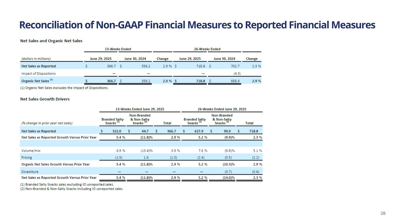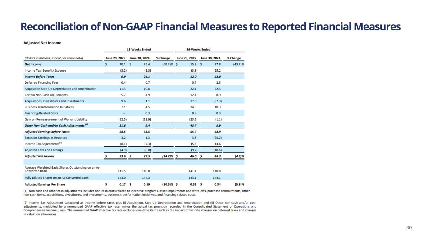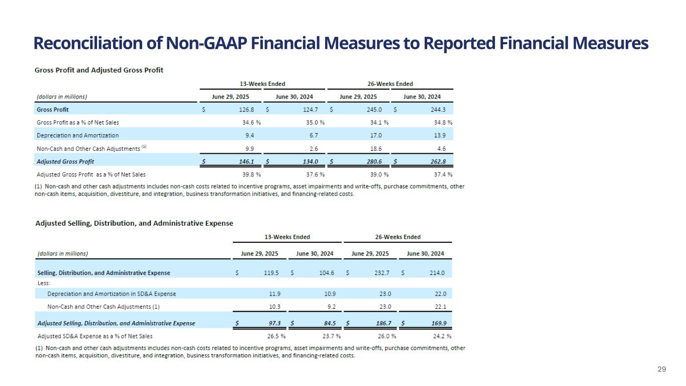 Reconciliation of Non-GAAP Financial Measures to Reported Financial Measures 32 (1) Interest Income (IO loans) refers to interest income that we earn from IO notes receivable that has resulted from our initiatives to transition from RSP distribution to IO distribution ("Business Transformation Initiatives"). There is a notes payable recorded that mirrors most of the IO notes receivable, and the interest expense associated with the notes payable is part of the Interest Expense, Net adjustment. (2) Certain Non-Cash Adjustments are comprised primarily of the following: Incentive programs – The Company incurred $2.7 million and $4.5 million of share-based compensation expense for awards to employees and directors, and compensation expense associated with the Omnibus Equity Incentive Plan (the "OEIP") for the thirteen weeks ended June 29, 2025 and June 30, 2024, respectively. The Company incurred $6.2 million and $8.4 million of share-based compensation expense for awards to employees and directors, and compensation expense associated with the OEIP for the twenty-six weeks ended June 29, 2025 and June 30, 2024, respectively. Loss on impairment - The Company recorded an impairment charge of $.0.6 million during the thirteen weeks ended June 29, 2025. Purchase commitments and other adjustments – We have purchase commitments for specific quantities at fixed prices for certain of our products’ key ingredients. To facilitate comparisons of our underlying operating results, this adjustment was made to remove the volatility of purchase commitment related unrealized gains and losses. The adjustment related to purchase commitments and other adjustments, including cloud computing amortization, was expense of $2.1 million and $0.4 million for the thirteen weeks ended June 29, 2025 and June 30, 2024, respectively. The adjustment related to purchase commitments and other adjustments, including cloud computing amortization, was expense of $4.3 million and $0.5 million for the twenty-six weeks ended June 29, 2025 and June 30, 2024, respectively. (3) Acquisitions, Divestitures and Investments – This is comprised of consulting, transaction services, and legal fees incurred for acquisitions and certain potential acquisitions, in addition to expenses associated with integrating recent acquisitions. Such expenses were $8.6 million and $1.1 million for the thirteen weeks ended June 29, 2025 and June 30, 2024, respectively; and $16.0 million and $6.7 million for the twenty-six weeks ended June 29, 2025 and June 30, 2024, respectively. Also included in the thirteen weeks ended June 29, 2025 was expense of $1.0 million related to the change in the liability association with a Tax Receivable Agreement. Also included for the twenty-six weeks ended June 30, 2024 was a gain of $44.0 million related to the Good Health and R.W. Garcia Sale. (4) Business Transformation Initiatives – This adjustment is related to consultancy, professional and legal fees incurred for specific initiatives and structural changes to the business that do not reflect the cost of normal business operations. In addition, gains and losses realized from the sale of distribution rights to IOs and the subsequent disposal of trucks, severance costs associated with the elimination of RSP positions, and enterprise resource planning system transition costs fall into this category. The Company incurred such costs of $7.1 million and $4.5 million for the thirteen weeks ended June 29, 2025 and June 30, 2024, respectively; and $14.5 million and $10.3 million for the twenty-six weeks ended June 29, 2025 and June 30, 2024, respectively. (5) Financing-Related Costs – These costs include adjustments for various items related to raising debt and equity capital or debt extinguishment costs. (6) Gains and Losses on Remeasurement of Warrant Liabilities - These liabilities are not expected to be settled in cash, and when exercised would result in a cash inflow to the Company with the warrants converting to Class A Common Stock with the liability being extinguished and the fair value of the warrants at the time of exercise being recorded as an increase to equity.