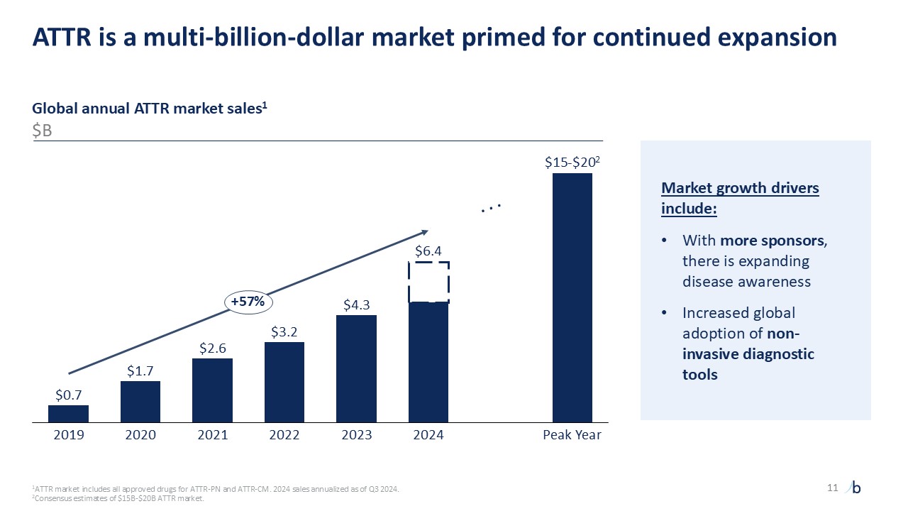 Market growth drivers include:  With more sponsors, there is expanding disease awareness   Increased global adoption of non-invasive diagnostic tools  Global annual ATTR market sales1  $B  2019  2020  2021  2022  2023  2024  Peak Year  $6.4  $15-$202  +57%  1ATTR market includes all approved drugs for ATTR-PN and ATTR-CM. 2024 sales annualized as of Q3 2024. 2Consensus estimates of $15B-$20B ATTR market.   ATTR is a multi-billion-dollar market primed for continued expansion  . . .