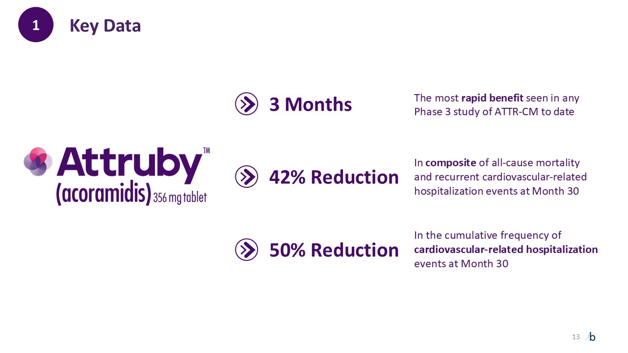 The most rapid benefit seen in any Phase 3 study of ATTR-CM to date  In composite of all-cause mortality and recurrent cardiovascular-related hospitalization events at Month 30  In the cumulative frequency of cardiovascular-related hospitalization events at Month 30  3 Months  42% Reduction  50% Reduction   Key Data  1