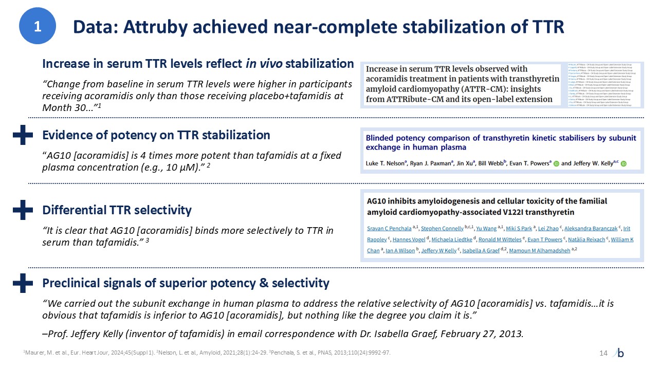 Data: Attruby achieved near-complete stabilization of TTR  1Maurer, M. et al., Eur. Heart Jour, 2024;45(Suppl 1). 2Nelson, L. et al., Amyloid, 2021;28(1):24-29. 3Penchala, S. et al., PNAS, 2013;110(24):9992-97.   Preclinical signals of superior potency & selectivity  “We carried out the subunit exchange in human plasma to address the relative selectivity of AG10 [acoramidis] vs. tafamidis…it is obvious that tafamidis is inferior to AG10 [acoramidis], but nothing like the degree you claim it is.”   –Prof. Jeffery Kelly (inventor of tafamidis) in email correspondence with Dr. Isabella Graef, February 27, 2013.  1  Differential TTR selectivity  “It is clear that AG10 [acoramidis] binds more selectively to TTR in serum than tafamidis.” 3  Evidence of potency on TTR stabilization  “AG10 [acoramidis] is 4 times more potent than tafamidis at a fixed plasma concentration (e.g., 10 μM).” 2  Increase in serum TTR levels reflect in vivo stabilization  “Change from baseline in serum TTR levels were higher in participants receiving acoramidis only than those receiving placebo+tafamidis at Month 30...”1