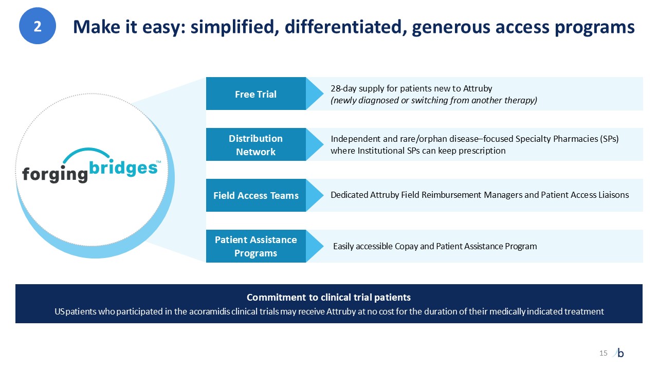 Make it easy: simplified, differentiated, generous access programs  28-day supply for patients new to Attruby (newly diagnosed or switching from another therapy)   Independent and rare/orphan disease–focused Specialty Pharmacies (SPs)   where Institutional SPs can keep prescription  Dedicated Attruby Field Reimbursement Managers and Patient Access Liaisons   Easily accessible Copay and Patient Assistance Program  Free Trial  Distribution Network  Field Access Teams  Patient Assistance Programs  Commitment to clinical trial patients  US patients who participated in the acoramidis clinical trials may receive Attruby at no cost for the duration of their medically indicated treatment  2