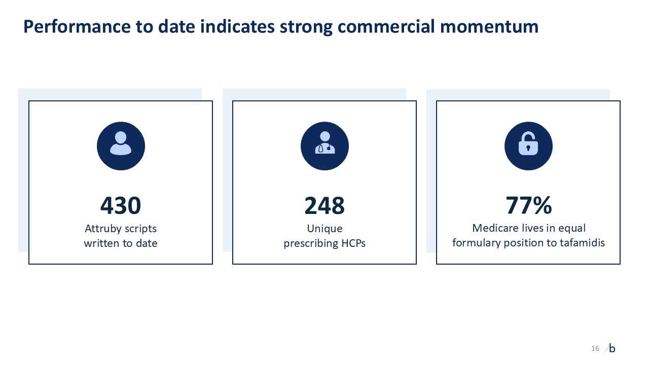 Performance to date indicates strong commercial momentum  430   Attruby scripts   written to date  248   Unique   prescribing HCPs   77%   Medicare lives in equal   formulary position to tafamidis