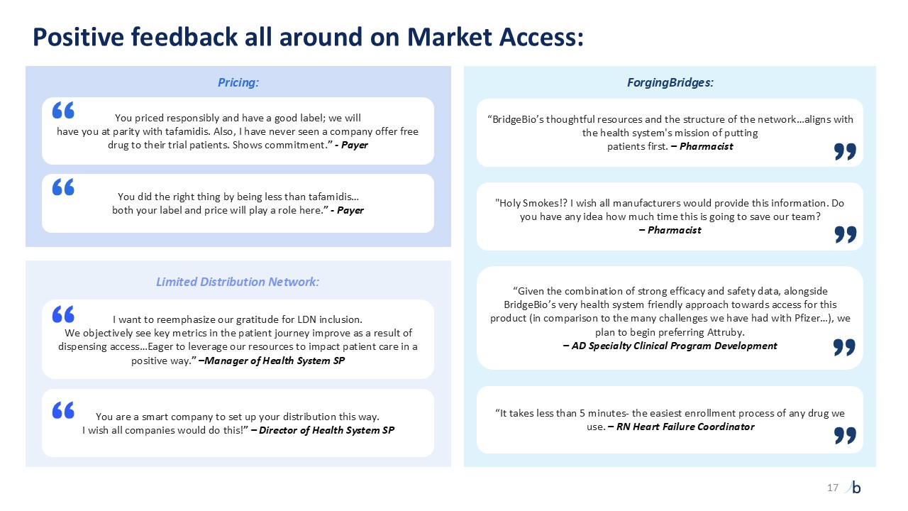 You priced responsibly and have a good label; we will   have you at parity with tafamidis. Also, I have never seen a company offer free drug to their trial patients. Shows commitment.” - Payer   “  You did the right thing by being less than tafamidis…   both your label and price will play a role here.” - Payer   “  I want to reemphasize our gratitude for LDN inclusion.   We objectively see key metrics in the patient journey improve as a result of dispensing access…Eager to leverage our resources to impact patient care in a positive way.” –Manager of Health System SP  “  You are a smart company to set up your distribution this way.   I wish all companies would do this!” – Director of Health System SP  “  “BridgeBio’s thoughtful resources and the structure of the network…aligns with the health system's mission of putting   patients first. – Pharmacist   "Holy Smokes!? I wish all manufacturers would provide this information. Do you have any idea how much time this is going to save our team?   – Pharmacist  “Given the combination of strong efficacy and safety data, alongside BridgeBio’s very health system friendly approach towards access for this product (in comparison to the many challenges we have had with Pfizer…), we plan to begin preferring Attruby.   – AD Specialty Clinical Program Development   “It takes less than 5 minutes- the easiest enrollment process of any drug we use. – RN Heart Failure Coordinator   “  Pricing:  Limited Distribution Network:   ForgingBridges:  “  “  “  Positive feedback all around on Market Access: