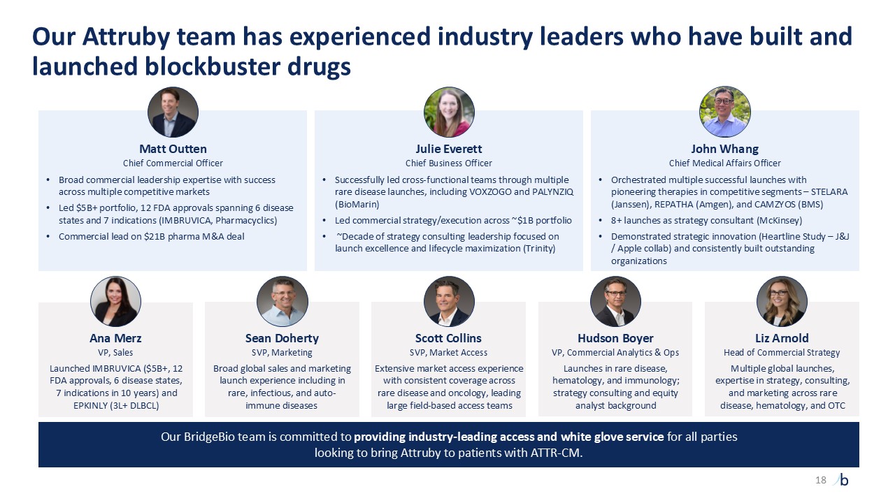 Scott Collins  SVP, Market Access  Ana Merz  VP, Sales  Launched IMBRUVICA ($5B+, 12 FDA approvals, 6 disease states,   7 indications in 10 years) and EPKINLY (3L+ DLBCL)  Liz Arnold  Head of Commercial Strategy  Multiple global launches, expertise in strategy, consulting, and marketing across rare disease, hematology, and OTC   Sean Doherty  SVP, Marketing  Broad global sales and marketing launch experience including in rare, infectious, and auto-immune diseases   Hudson Boyer  VP, Commercial Analytics & Ops  Launches in rare disease, hematology, and immunology; strategy consulting and equity analyst background  Extensive market access experience with consistent coverage acrossrare disease and oncology, leading large field-based access teams  Julie Everett  Chief Business Officer  Successfully led cross-functional teams through multiple rare disease launches, including VOXZOGO and PALYNZIQ (BioMarin)  Led commercial strategy/execution across ~$1B portfolio   ~Decade of strategy consulting leadership focused on launch excellence and lifecycle maximization (Trinity)  John Whang  Chief Medical Affairs Officer  Orchestrated multiple successful launches with pioneering therapies in competitive segments – STELARA (Janssen), REPATHA (Amgen), and CAMZYOS (BMS)  8+ launches as strategy consultant (McKinsey)  Demonstrated strategic innovation (Heartline Study – J&J / Apple collab) and consistently built outstanding organizations  Matt Outten  Chief Commercial Officer  Broad commercial leadership expertise with success across multiple competitive markets  Led $5B+ portfolio, 12 FDA approvals spanning 6 disease states and 7 indications (IMBRUVICA, Pharmacyclics)  Commercial lead on $21B pharma M&A deal  Our BridgeBio team is committed to providing industry-leading access and white glove service for all parties   looking to bring Attruby to patients with ATTR-CM.   Our Attruby team has experienced industry leaders who have built and launched blockbuster drugs