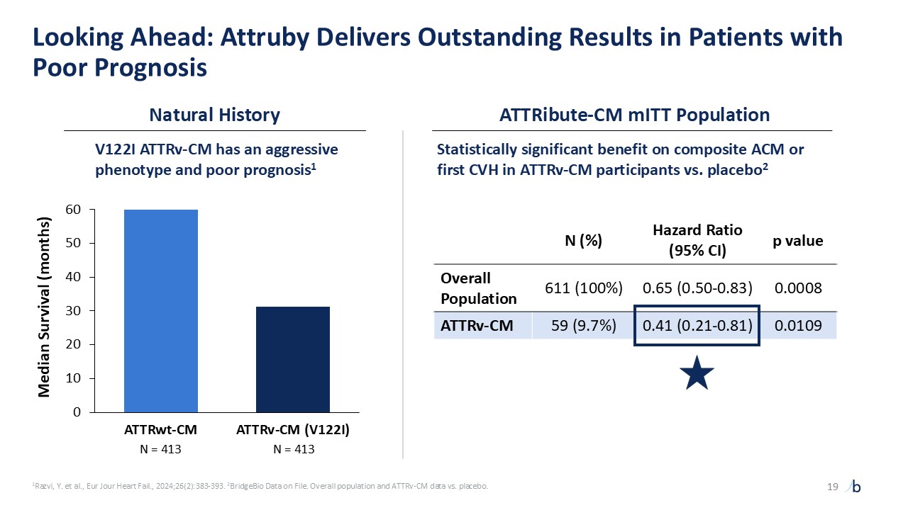 Looking Ahead: Attruby Delivers Outstanding Results in Patients with Poor Prognosis  Median Survival (months)  ATTRwt-CM  ATTRv-CM (V122I)  V122I ATTRv-CM has an aggressive phenotype and poor prognosis1  N = 413  Statistically significant benefit on composite ACM or first CVH in ATTRv-CM participants vs. placebo2  N (%)  Hazard Ratio (95% CI)  p value  Overall Population  611 (100%)  0.65 (0.50-0.83)  0.0008  ATTRv-CM  59 (9.7%)  0.41 (0.21-0.81)  0.0109  Natural History  ATTRibute-CM mITT Population  N = 413  1Razvi, Y. et al., Eur Jour Heart Fail., 2024;26(2):383-393. 2BridgeBio Data on File. Overall population and ATTRv-CM data vs. placebo.