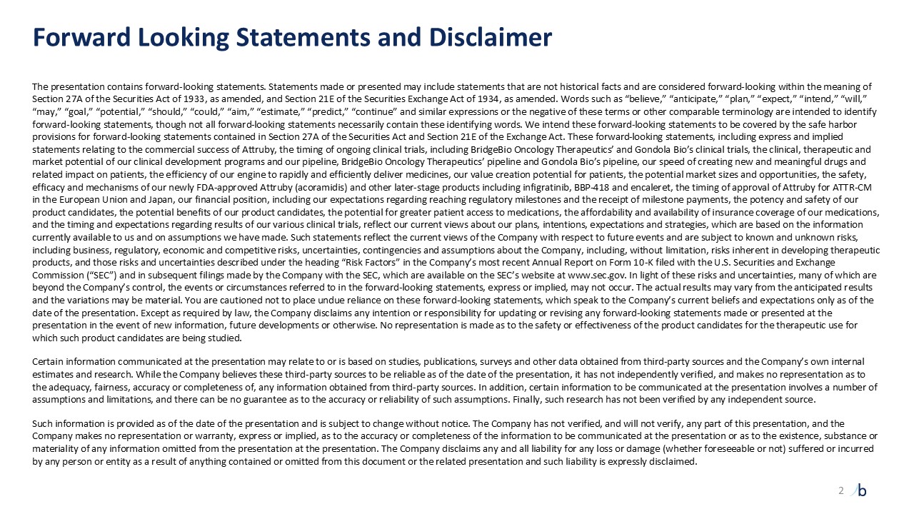 Forward Looking Statements and Disclaimer  The presentation contains forward-looking statements. Statements made or presented may include statements that are not historical facts and are considered forward-looking within the meaning of Section 27A of the Securities Act of 1933, as amended, and Section 21E of the Securities Exchange Act of 1934, as amended. Words such as “believe,” “anticipate,” “plan,” “expect,” “intend,” “will,” “may,” “goal,” “potential,” “should,” “could,” “aim,” “estimate,” “predict,” “continue” and similar expressions or the negative of these terms or other comparable terminology are intended to identify forward-looking statements, though not all forward-looking statements necessarily contain these identifying words. We intend these forward-looking statements to be covered by the safe harbor provisions for forward-looking statements contained in Section 27A of the Securities Act and Section 21E of the Exchange Act. These forward-looking statements, including express and implied statements relating to the commercial success of Attruby, the timing of ongoing clinical trials, including BridgeBio Oncology Therapeutics’ and Gondola Bio’s clinical trials, the clinical, therapeutic and market potential of our clinical development programs and our pipeline, BridgeBio Oncology Therapeutics’ pipeline and Gondola Bio’s pipeline, our speed of creating new and meaningful drugs and related impact on patients, the efficiency of our engine to rapidly and efficiently deliver medicines, our value creation potential for patients, the potential market sizes and opportunities, the safety, efficacy and mechanisms of our newly FDA-approved Attruby (acoramidis) and other later-stage products including infigratinib, BBP-418 and encaleret, the timing of approval of Attruby for ATTR-CM in the European Union and Japan, our financial position, including our expectations regarding reaching regulatory milestones and the receipt of milestone payments, the potency and safety of our product candidates, the potential benefits of our product candidates, the potential for greater patient access to medications, the affordability and availability of insurance coverage of our medications, and the timing and expectations regarding results of our various clinical trials, reflect our current views about our plans, intentions, expectations and strategies, which are based on the information currently available to us and on assumptions we have made. Such statements reflect the current views of the Company with respect to future events and are subject to known and unknown risks, including business, regulatory, economic and competitive risks, uncertainties, contingencies and assumptions about the Company, including, without limitation, risks inherent in developing therapeutic products, and those risks and uncertainties described under the heading “Risk Factors” in the Company’s most recent Annual Report on Form 10-K filed with the U.S. Securities and Exchange Commission (“SEC”) and in subsequent filings made by the Company with the SEC, which are available on the SEC’s website at www.sec.gov. In light of these risks and uncertainties, many of which are beyond the Company’s control, the events or circumstances referred to in the forward-looking statements, express or implied, may not occur. The actual results may vary from the anticipated results and the variations may be material. You are cautioned not to place undue reliance on these forward-looking statements, which speak to the Company’s current beliefs and expectations only as of the date of the presentation. Except as required by law, the Company disclaims any intention or responsibility for updating or revising any forward-looking statements made or presented at the presentation in the event of new information, future developments or otherwise. No representation is made as to the safety or effectiveness of the product candidates for the therapeutic use for which such product candidates are being studied.   Certain information communicated at the presentation may relate to or is based on studies, publications, surveys and other data obtained from third-party sources and the Company’s own internal estimates and research. While the Company believes these third-party sources to be reliable as of the date of the presentation, it has not independently verified, and makes no representation as to the adequacy, fairness, accuracy or completeness of, any information obtained from third-party sources. In addition, certain information to be communicated at the presentation involves a number of assumptions and limitations, and there can be no guarantee as to the accuracy or reliability of such assumptions. Finally, such research has not been verified by any independent source.   Such information is provided as of the date of the presentation and is subject to change without notice. The Company has not verified, and will not verify, any part of this presentation, and the Company makes no representation or warranty, express or implied, as to the accuracy or completeness of the information to be communicated at the presentation or as to the existence, substance or materiality of any information omitted from the presentation at the presentation. The Company disclaims any and all liability for any loss or damage (whether foreseeable or not) suffered or incurred by any person or entity as a result of anything contained or omitted from this document or the related presentation and such liability is expressly disclaimed.