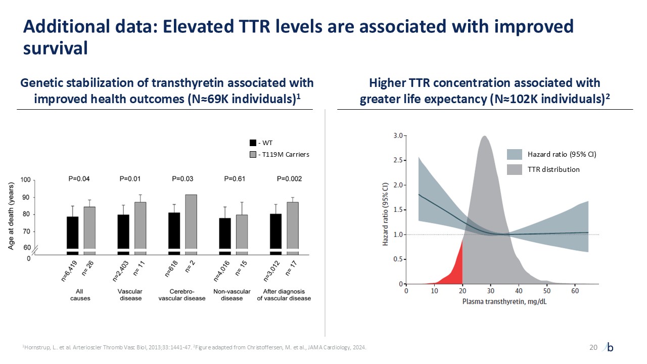1Hornstrup, L.. et al. Arterioscler Thromb Vasc Biol, 2013;33:1441-47. 2Figure adapted from Christoffersen, M. et al., JAMA Cardiology, 2024.  Hazard ratio (95% CI)  TTR distribution  Additional data: Elevated TTR levels are associated with improved survival  Higher TTR concentration associated with greater life expectancy (N≈102K individuals)2  Genetic stabilization of transthyretin associated with improved health outcomes (N≈69K individuals)1  - WT  - T119M Carriers