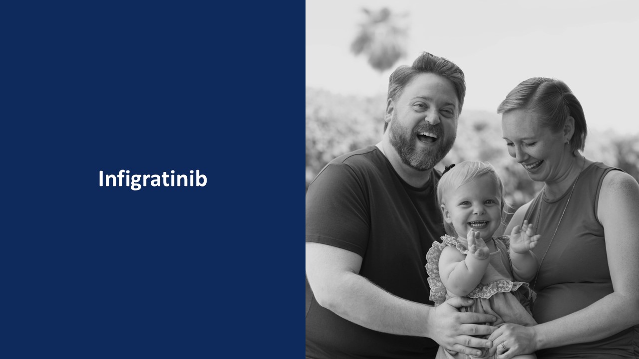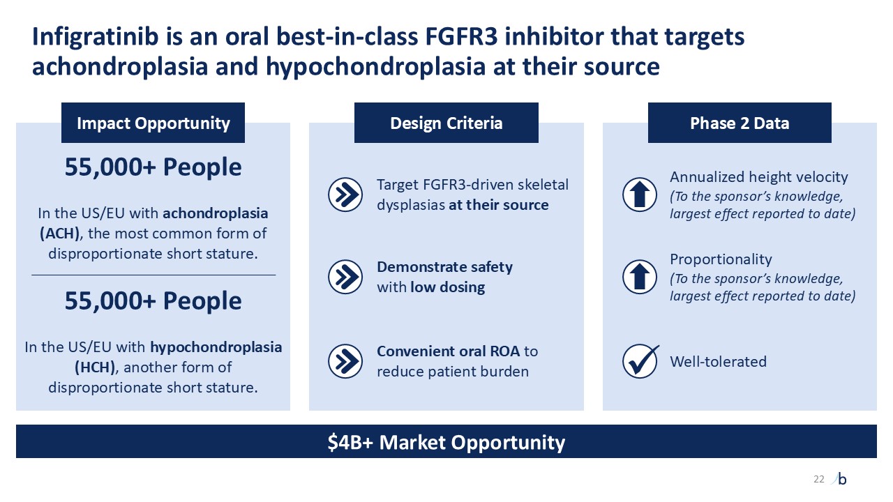 Design Criteria  55,000+ People  In the US/EU with achondroplasia (ACH), the most common form of disproportionate short stature.  55,000+ People  In the US/EU with hypochondroplasia (HCH), another form of disproportionate short stature.  Impact Opportunity  Phase 2 Data  $4B+ Market Opportunity  Infigratinib is an oral best-in-class FGFR3 inhibitor that targets achondroplasia and hypochondroplasia at their source  Annualized height velocity  (To the sponsor’s knowledge, largest effect reported to date)  Target FGFR3-driven skeletal dysplasias at their source  Proportionality  (To the sponsor’s knowledge, largest effect reported to date)  Demonstrate safety   with low dosing    Well-tolerated  Convenient oral ROA to reduce patient burden