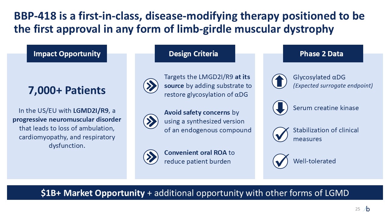 Design Criteria  7,000+ Patients  In the US/EU with LGMD2I/R9, a progressive neuromuscular disorder that leads to loss of ambulation, cardiomyopathy, and respiratory dysfunction.  Impact Opportunity  Phase 2 Data  BBP-418 is a first-in-class, disease-modifying therapy positioned to be the first approval in any form of limb-girdle muscular dystrophy  Glycosylated αDG  (Expected surrogate endpoint)  Serum creatine kinase    Stabilization of clinical measures    Well-tolerated  Targets the LMGD2I/R9 at its source by adding substrate to restore glycosylation of αDG  Avoid safety concerns by using a synthesized version of an endogenous compound  Convenient oral ROA to reduce patient burden  $1B+ Market Opportunity + additional opportunity with other forms of LGMD