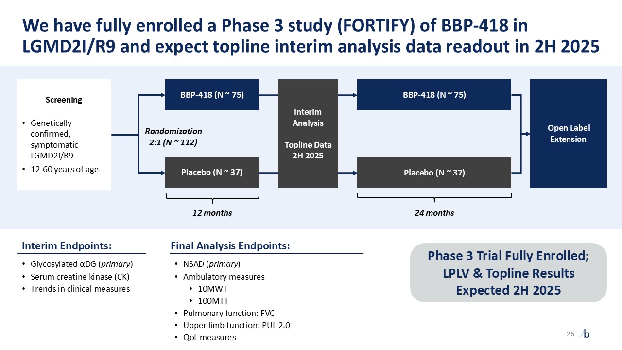 Screening  Genetically confirmed, symptomatic LGMD2I/R9  12-60 years of age  Randomization 2:1 (N ~ 112)  Open Label Extension  BBP-418 (N ~ 75)  BBP-418 (N ~ 75)  Placebo (N ~ 37)  Placebo (N ~ 37)  12 months  24 months  Final Analysis Endpoints:  NSAD (primary)  Ambulatory measures  10MWT  100MTT  Pulmonary function: FVC  Upper limb function: PUL 2.0  QoL measures  Interim Endpoints:  Glycosylated αDG (primary)  Serum creatine kinase (CK)  Trends in clinical measures  Interim Analysis  Topline Data 2H 2025  We have fully enrolled a Phase 3 study (FORTIFY) of BBP-418 in LGMD2I/R9 and expect topline interim analysis data readout in 2H 2025  Phase 3 Trial Fully Enrolled;   LPLV & Topline Results Expected 2H 2025