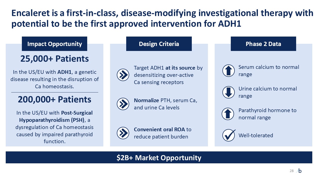 Design Criteria  25,000+ Patients  In the US/EU with ADH1, a genetic disease resulting in the disruption of Ca homeostasis.  200,000+ Patients  In the US/EU with Post-Surgical Hypoparathyroidism (PSH), a dysregulation of Ca homeostasis caused by impaired parathyroid function.  Impact Opportunity  Phase 2 Data  Encaleret is a first-in-class, disease-modifying investigational therapy with potential to be the first approved intervention for ADH1  Parathyroid hormone to normal range  Serum calcium to normal range    Well-tolerated  Urine calcium to normal range  Target ADH1 at its source by desensitizing over-active  Ca sensing receptors  Normalize PTH, serum Ca, and urine Ca levels  Convenient oral ROA to reduce patient burden  $2B+ Market Opportunity