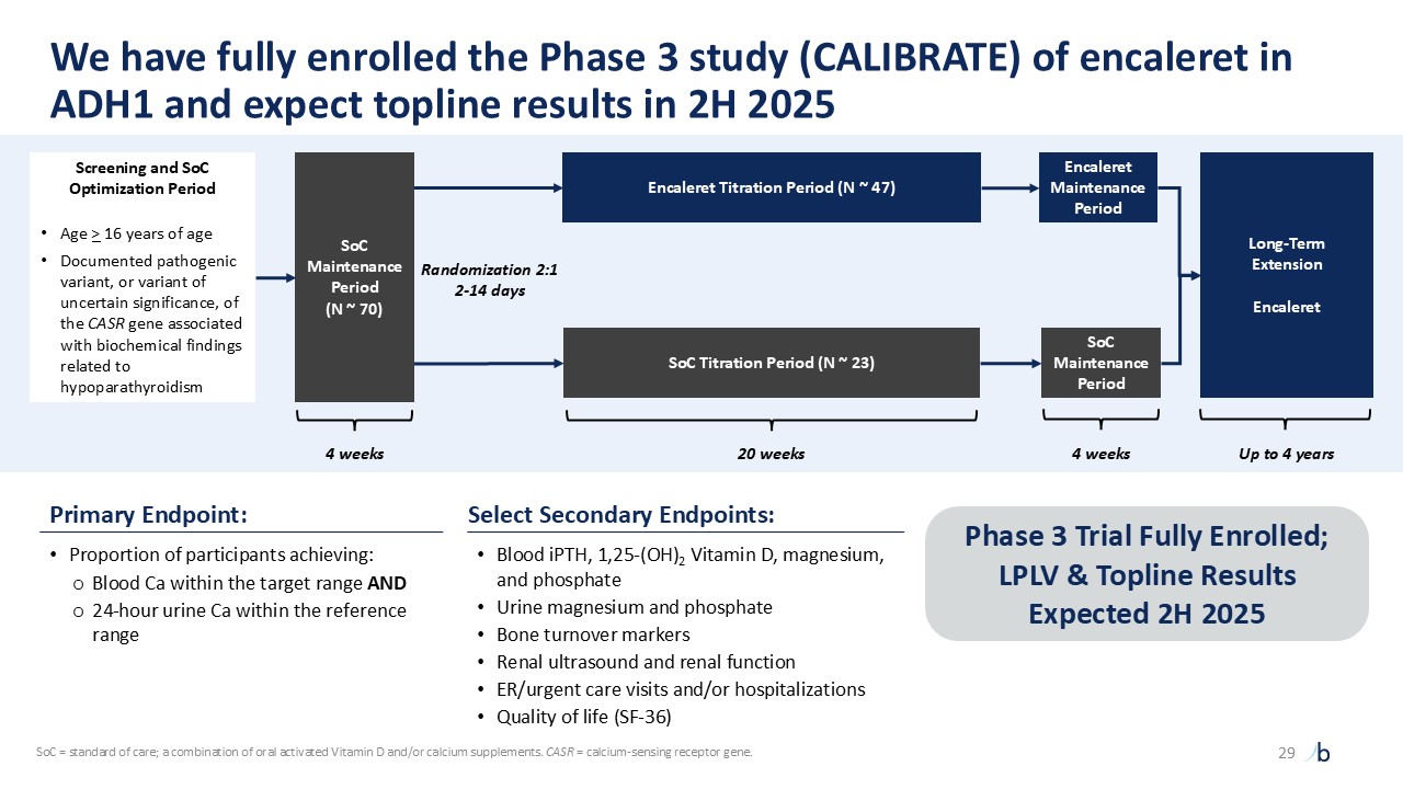 Select Secondary Endpoints:  Blood iPTH, 1,25-(OH)2 Vitamin D, magnesium, and phosphate  Urine magnesium and phosphate  Bone turnover markers   Renal ultrasound and renal function  ER/urgent care visits and/or hospitalizations  Quality of life (SF-36)  Primary Endpoint:  Proportion of participants achieving:   Blood Ca within the target range AND   24-hour urine Ca within the reference range  Screening and SoC Optimization Period  Age > 16 years of age  Documented pathogenic variant, or variant of uncertain significance, of the CASR gene associated with biochemical findings related to hypoparathyroidism  SoC Maintenance  Period  (N ~ 70)  Randomization 2:1  2-14 days  Long-Term Extension  Encaleret  Encaleret Titration Period (N ~ 47)  Encaleret  Maintenance Period  4 weeks  SoC Titration Period (N ~ 23)  SoC   Maintenance Period  20 weeks  4 weeks  SoC = standard of care; a combination of oral activated Vitamin D and/or calcium supplements. CASR = calcium-sensing receptor gene.   Phase 3 Trial Fully Enrolled;   LPLV & Topline Results Expected 2H 2025  We have fully enrolled the Phase 3 study (CALIBRATE) of encaleret in ADH1 and expect topline results in 2H 2025  Up to 4 years