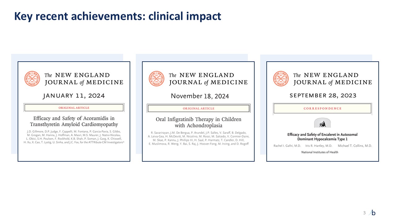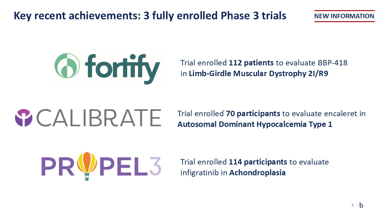 Key recent achievements: 3 fully enrolled Phase 3 trials  Trial enrolled 112 patients to evaluate BBP-418   in Limb-Girdle Muscular Dystrophy 2I/R9   Trial enrolled 70 participants to evaluate encaleret in Autosomal Dominant Hypocalcemia Type 1  Trial enrolled 114 participants to evaluate infigratinib in Achondroplasia  NEW INFORMATION