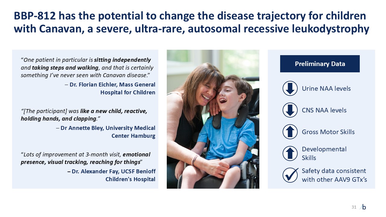 BBP-812 has the potential to change the disease trajectory for children with Canavan, a severe, ultra-rare, autosomal recessive leukodystrophy   “One patient in particular is sitting independently and taking steps and walking, and that is certainly something I’ve never seen with Canavan disease.”   – Dr. Florian Eichler, Mass General Hospital for Children  “[The participant] was like a new child, reactive, holding hands, and clapping.”    – Dr Annette Bley, University Medical Center Hamburg  “Lots of improvement at 3-month visit, emotional presence, visual tracking, reaching for things”   – Dr. Alexander Fay, UCSF Benioff Children's Hospital    Safety data consistent with other AAV9 GTx’s  Urine NAA levels  Preliminary Data  CNS NAA levels  Gross Motor Skills  Developmental Skills