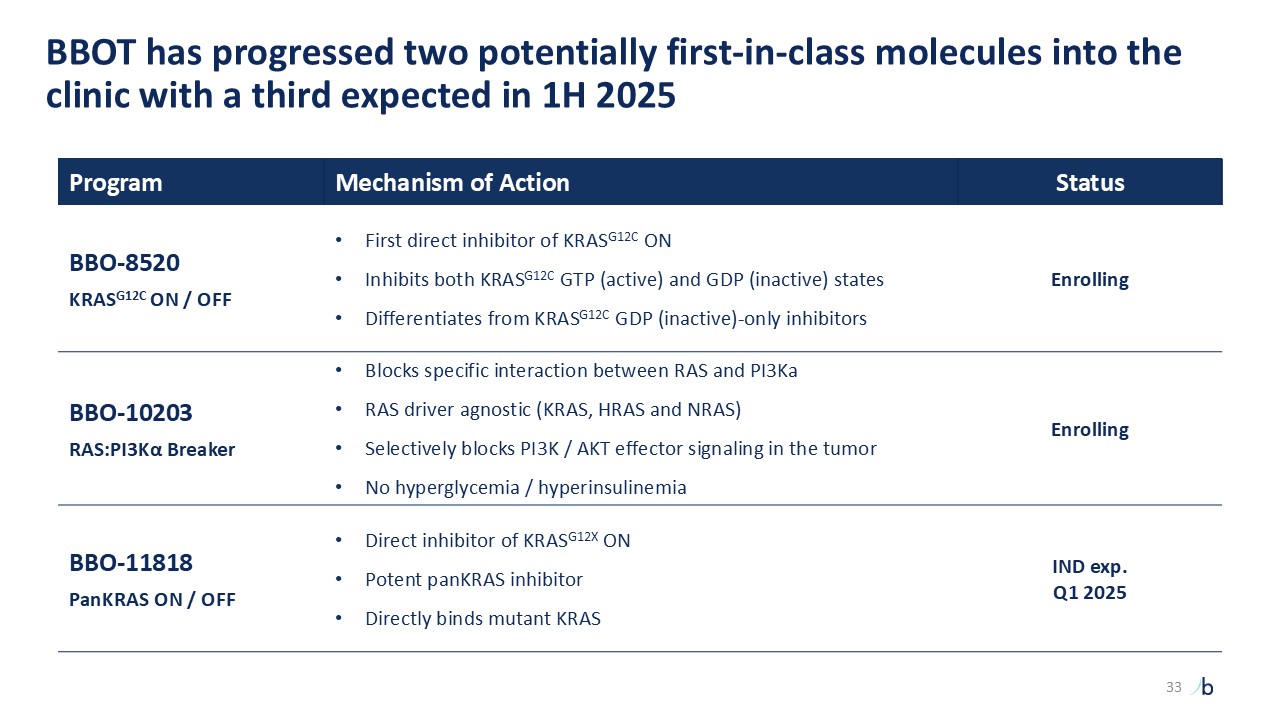 BBOT has progressed two potentially first-in-class molecules into the clinic with a third expected in 1H 2025  Program  Mechanism of Action  Status  BBO-8520  KRASG12C ON / OFF  First direct inhibitor of KRASG12C ON  Inhibits both KRASG12C GTP (active) and GDP (inactive) states  Differentiates from KRASG12C GDP (inactive)-only inhibitors  Enrolling  BBO-10203  RAS:PI3Kα Breaker  Blocks specific interaction between RAS and PI3Ka  RAS driver agnostic (KRAS, HRAS and NRAS)  Selectively blocks PI3K / AKT effector signaling in the tumor  No hyperglycemia / hyperinsulinemia  Enrolling  BBO-11818  PanKRAS ON / OFF  Direct inhibitor of KRASG12X ON  Potent panKRAS inhibitor  Directly binds mutant KRAS  IND exp.   Q1 2025