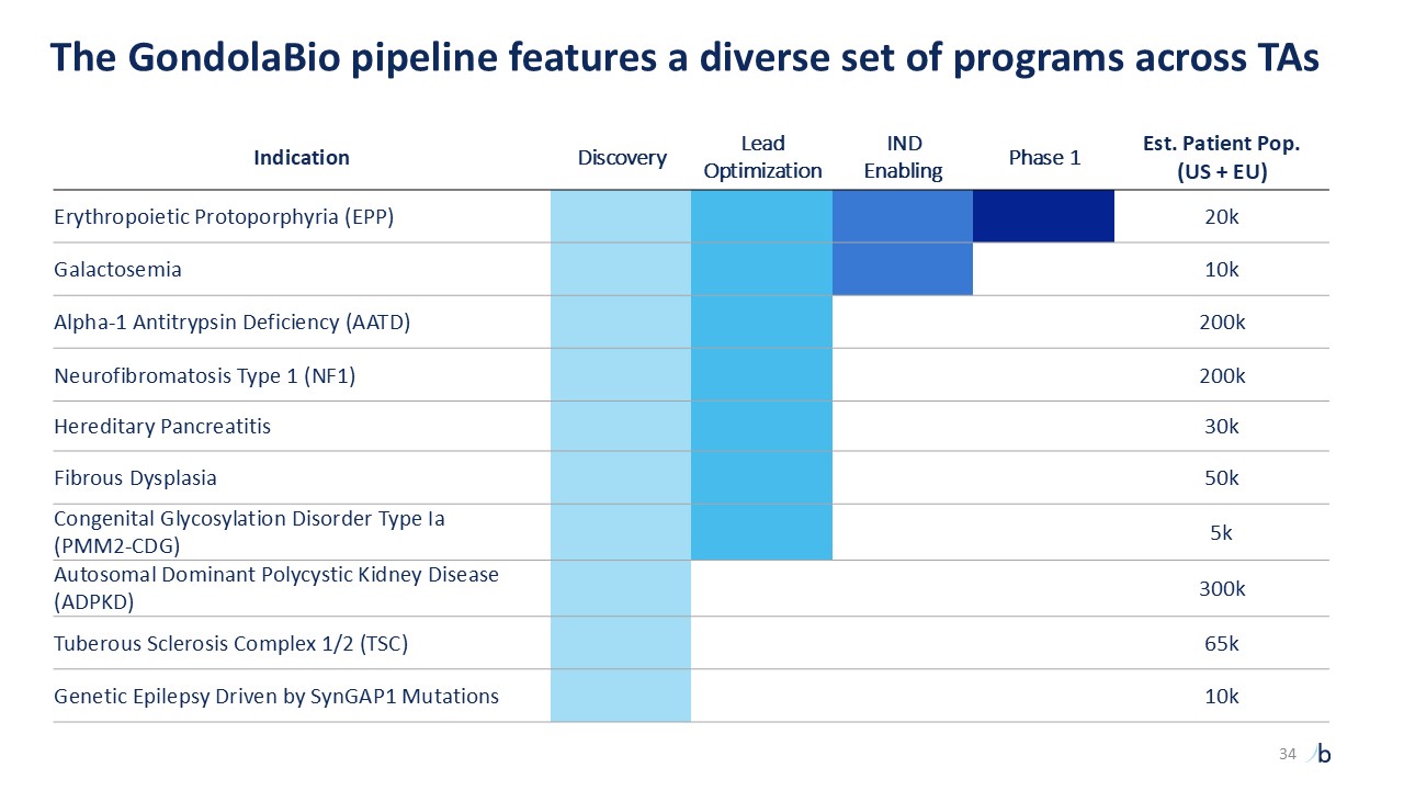 Indication  Discovery  Lead Optimization  IND   Enabling  Phase 1  Est. Patient Pop.  (US + EU)  Erythropoietic Protoporphyria (EPP)  20k  Galactosemia  10k  Alpha-1 Antitrypsin Deficiency (AATD)  200k  Neurofibromatosis Type 1 (NF1)  200k  Hereditary Pancreatitis  30k  Fibrous Dysplasia  50k  Congenital Glycosylation Disorder Type Ia   (PMM2-CDG)  5k  Autosomal Dominant Polycystic Kidney Disease (ADPKD)   300k  Tuberous Sclerosis Complex 1/2 (TSC)  65k  Genetic Epilepsy Driven by SynGAP1 Mutations  10k  The GondolaBio pipeline features a diverse set of programs across TAs